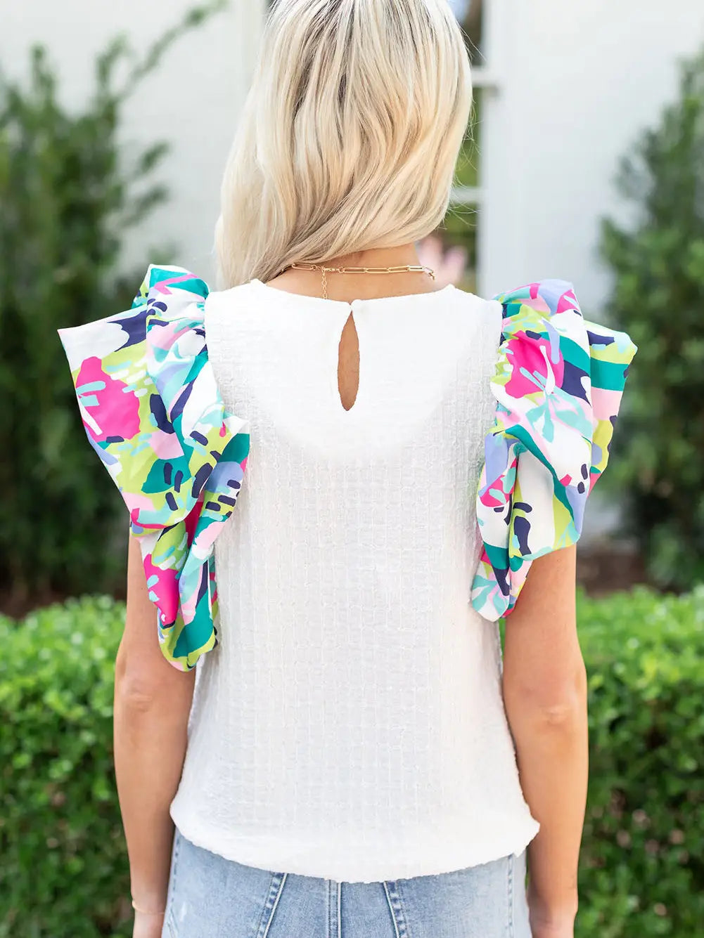 This women's top exudes a unique charm with its abstract print puff sleeves and textured knit body, making it perfect for a fancy brunch date. The delicate keyhole back adds a touch of refinement, while ensuring a fashionable and confident look. This top is definitely a standout piece!
