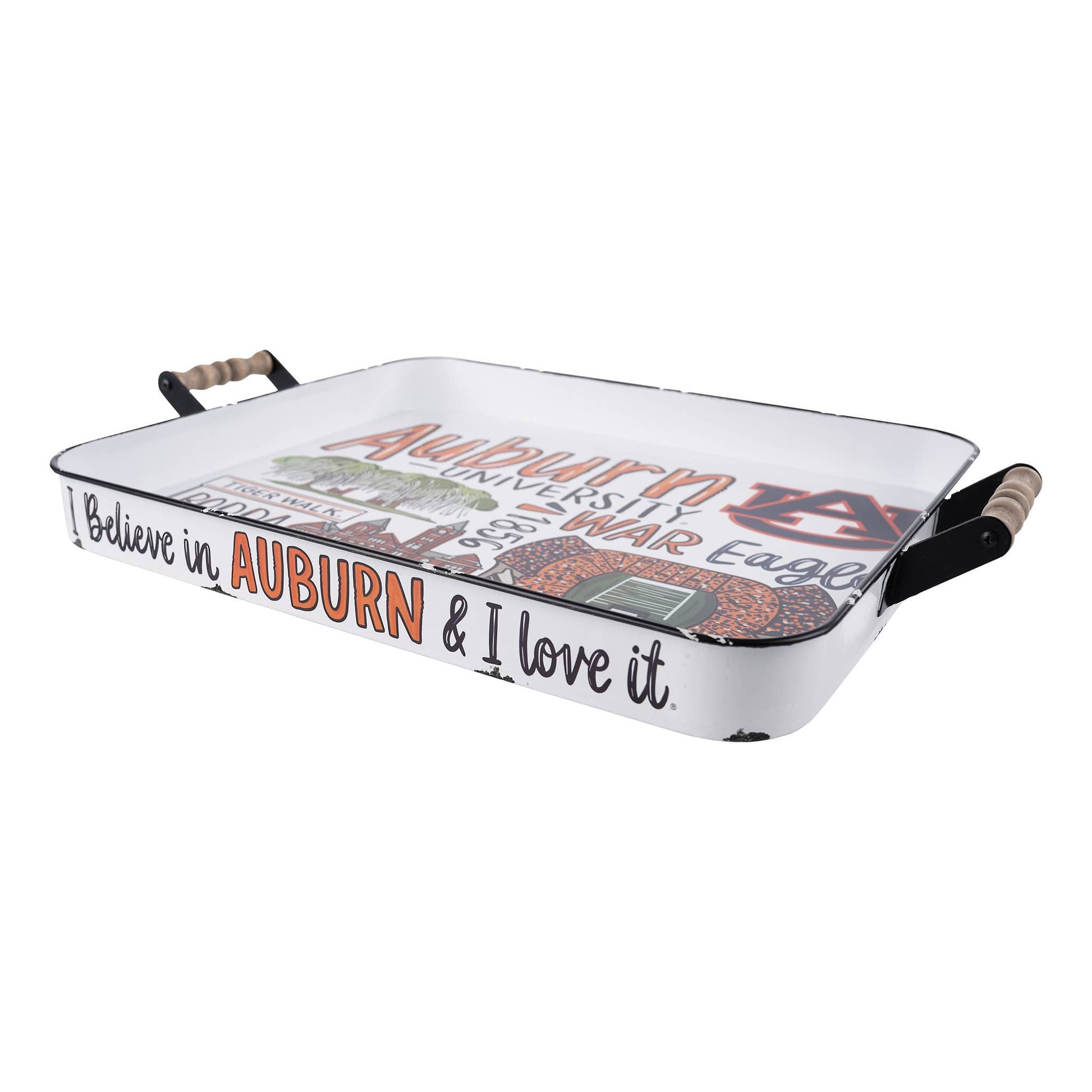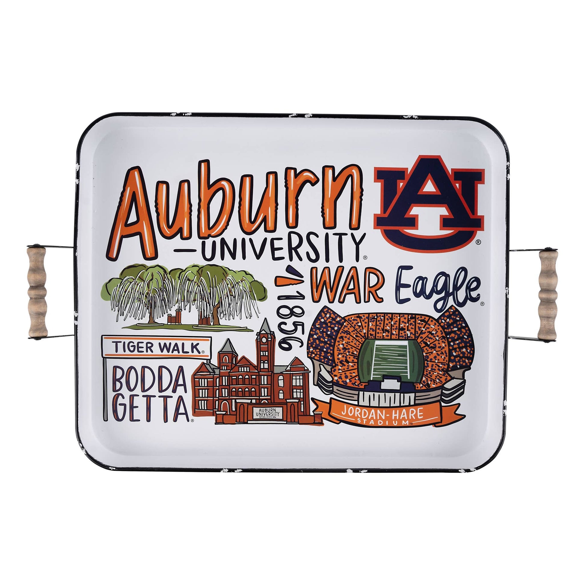 War Eagle! Show off all of Auburn's iconic landmarks with this enamel tray! From Jordan-Hare Stadium to Toomer's Corner, this tray is perfect for decoration or serving up your game-day favorites! Original design