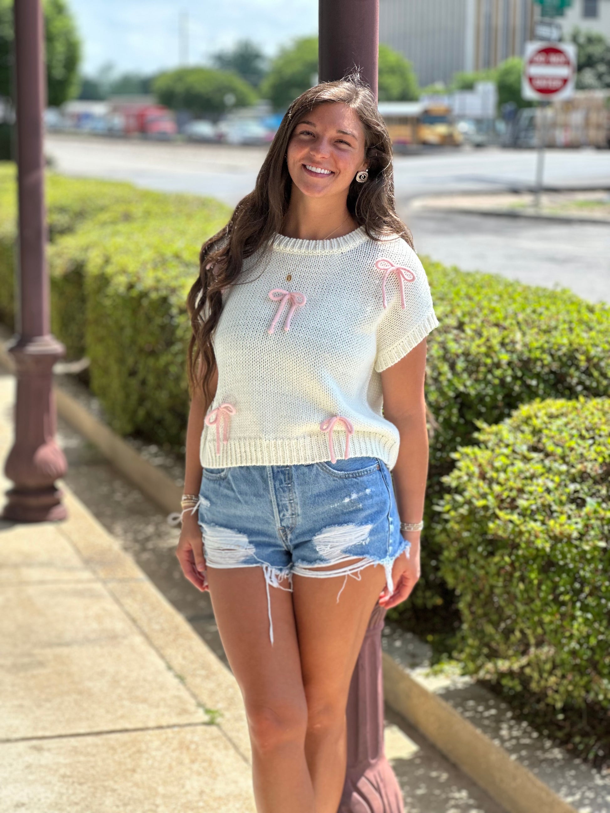 We want bows on everything & our Kylee top is perfection! Short sleeve knit sweaters are perfect for early spring & this top has endless outfit options!