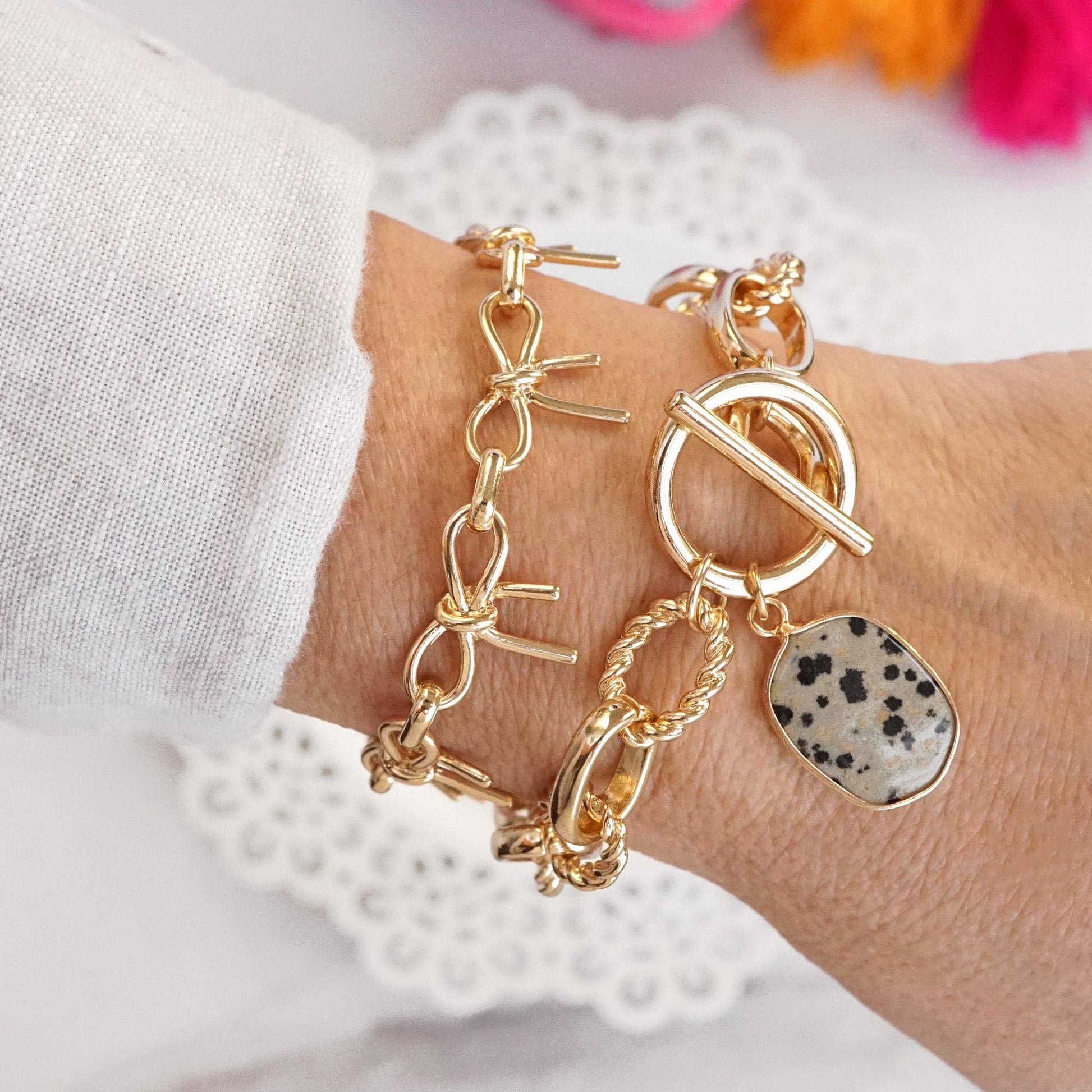 Bow Link Bracelet Gold Tone A stunning and trendy addition to your jewelry collection. Crafted from durable alloy in a beautiful gold tone, this eye-catching bracelet features a links design with toggle closure with to rings that ensures a comfortable fit. Elegant bow detail for a chic and sophisticated look.