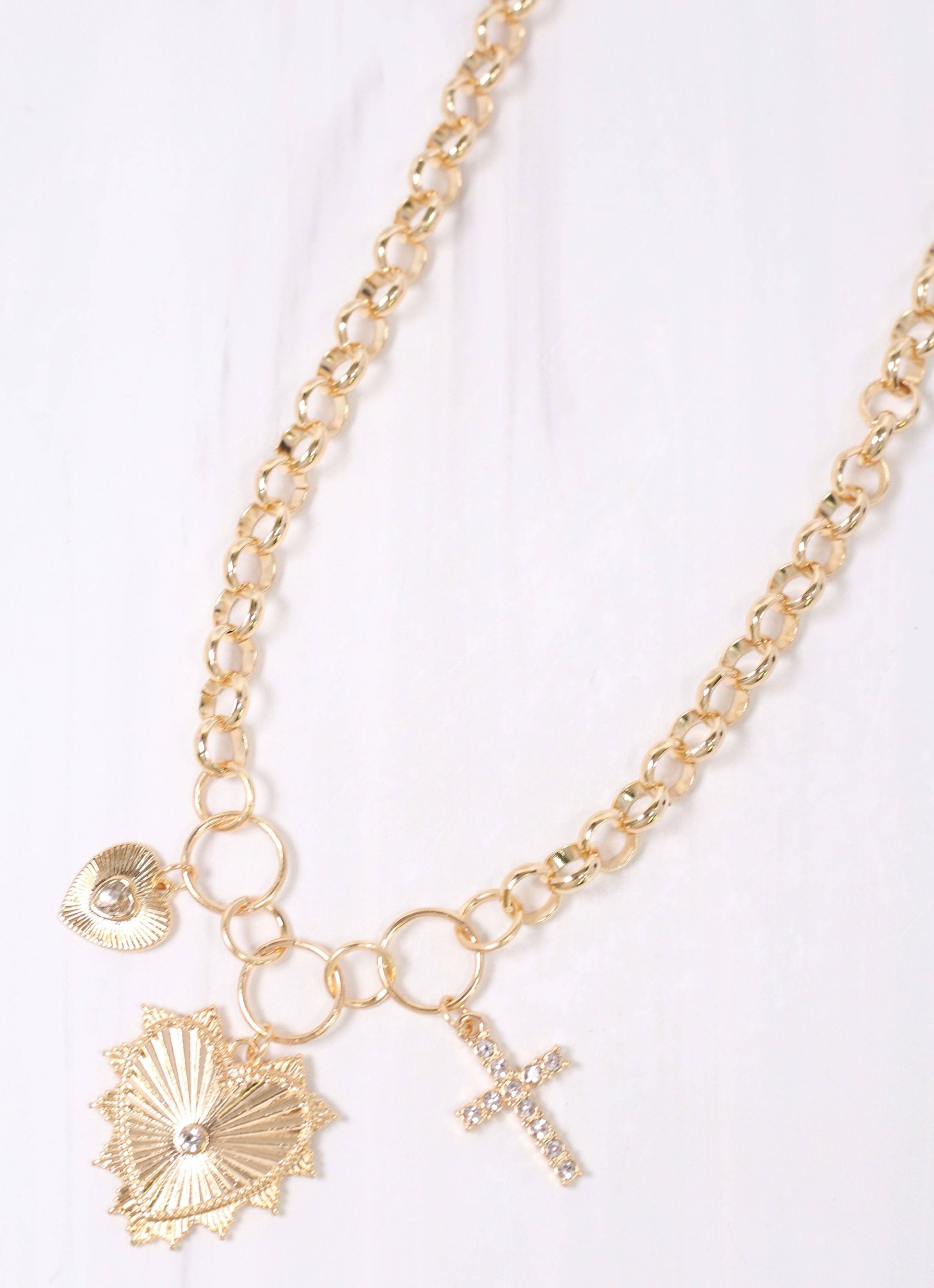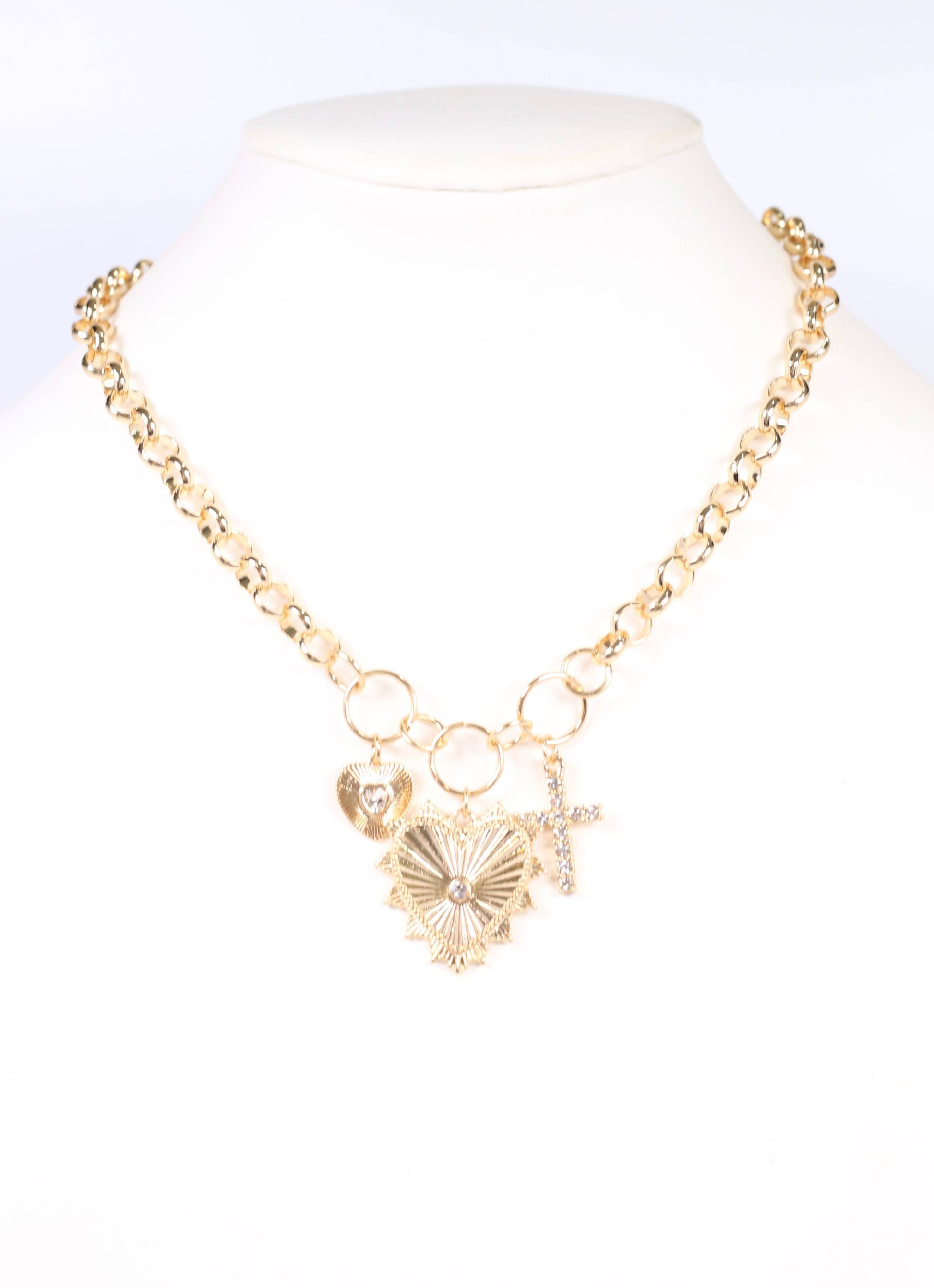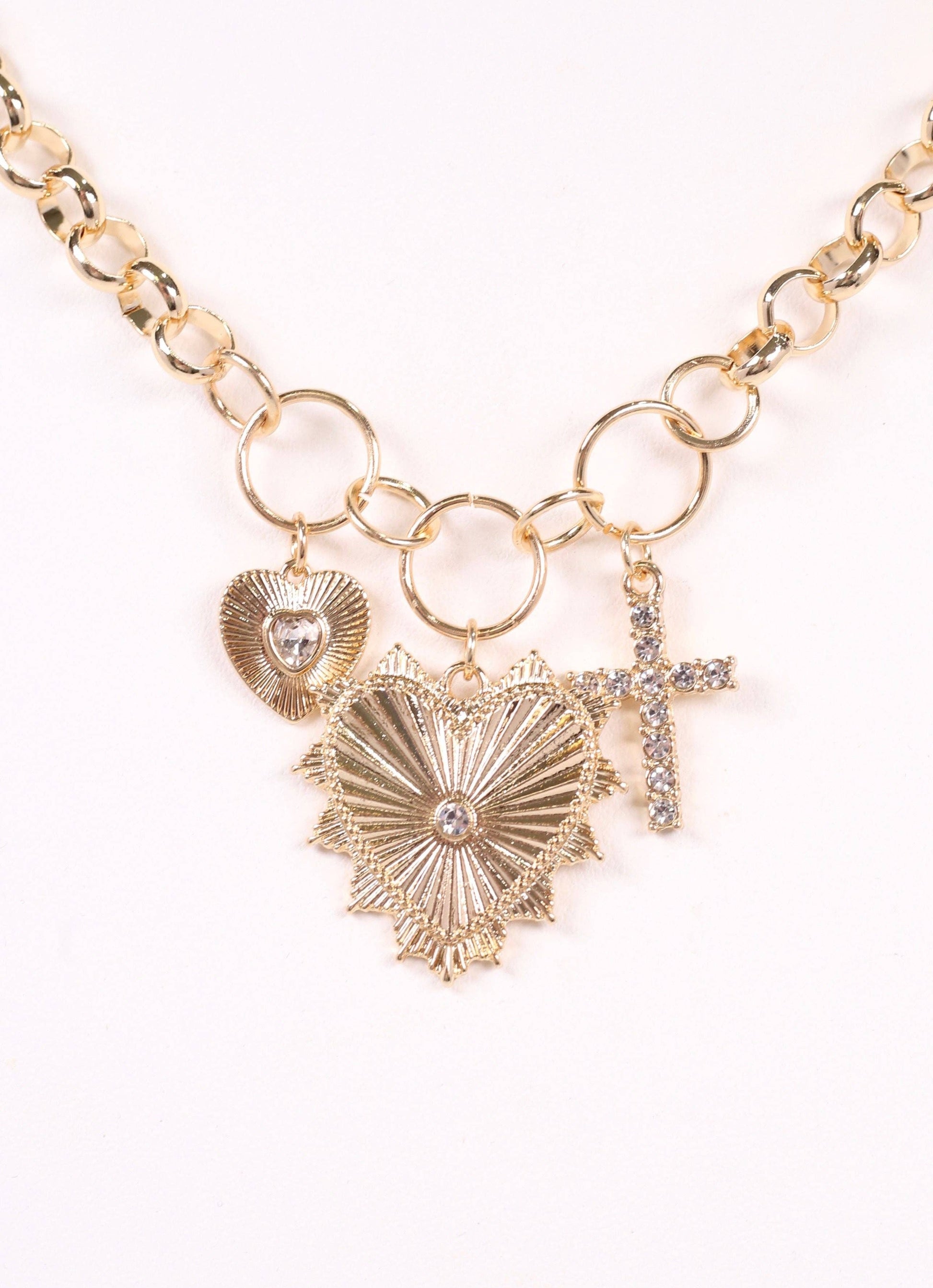 This circular link necklace features three gorgeous charms. There are two ribbed hearts with CZs and a CZ lined cross as well.