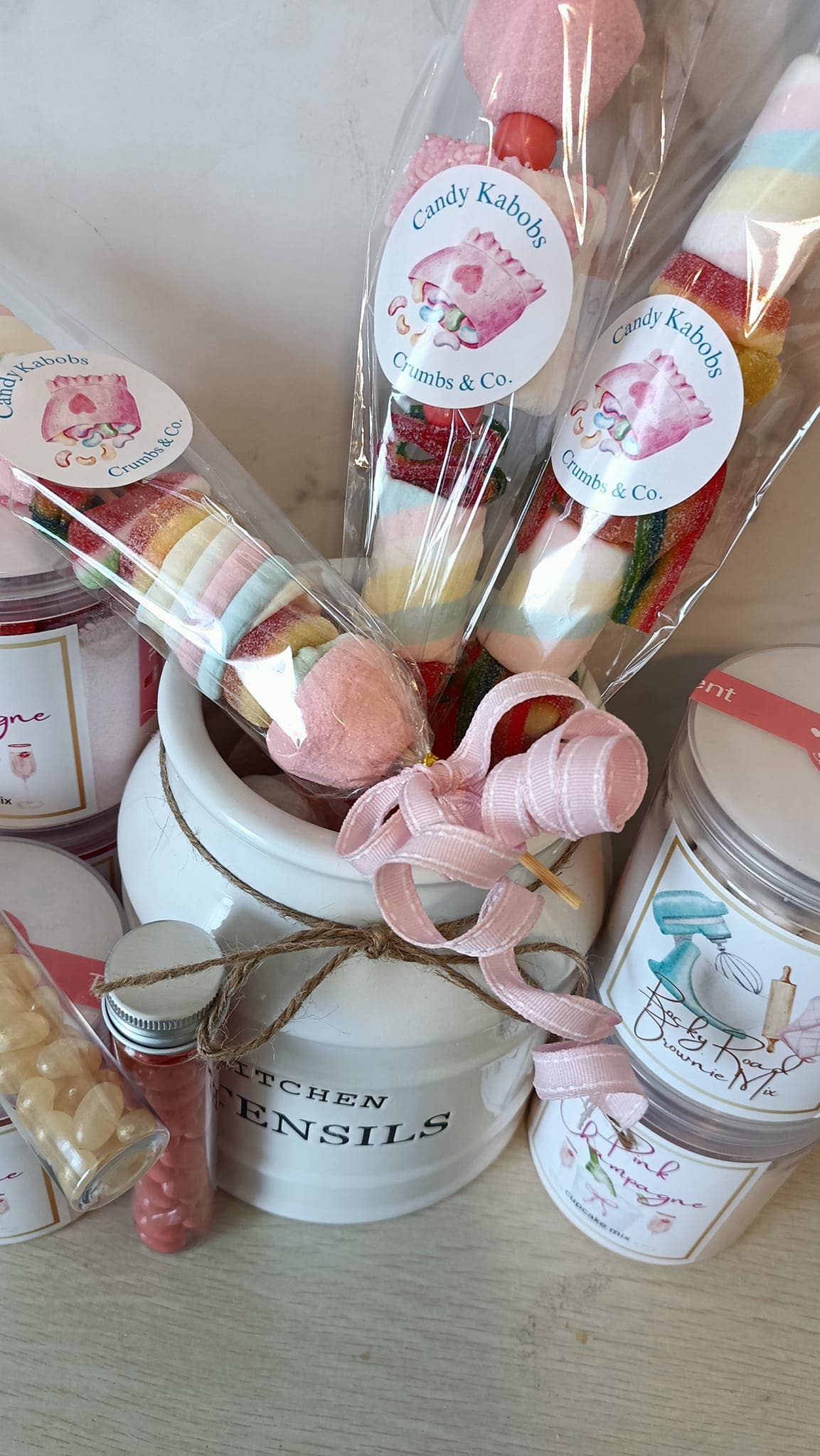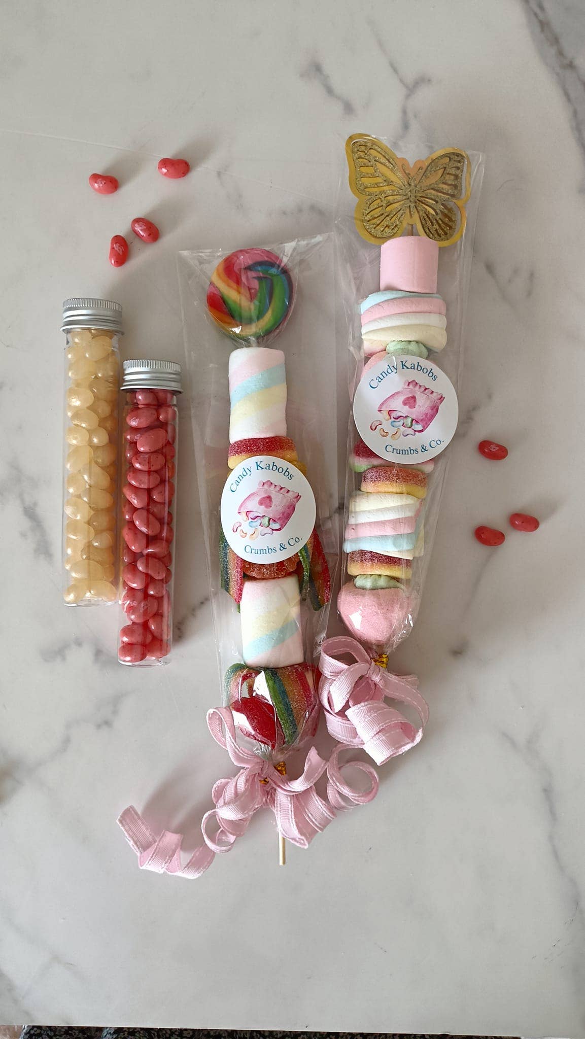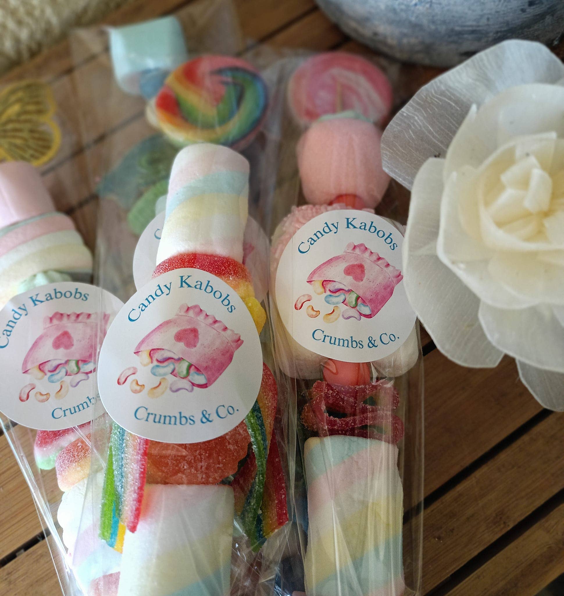 Each are on 11” wood skewers with about 9” of candy. Individually tied with curly ribbon. They are also shelf stable. Holiday themes coming as well. These come in a multi pack of various color hues, marshmallows, lollipops. gum balls and gummy candies.