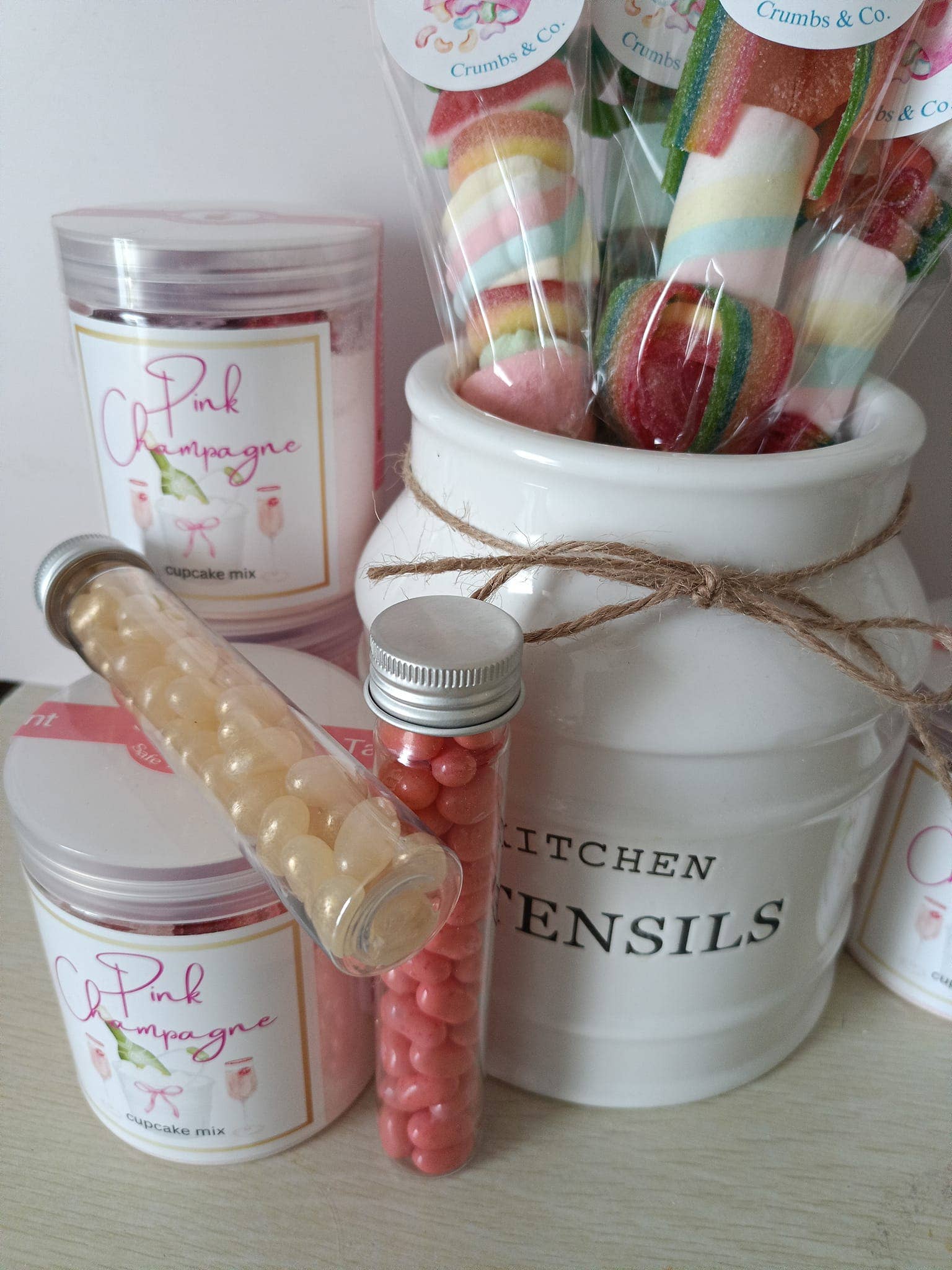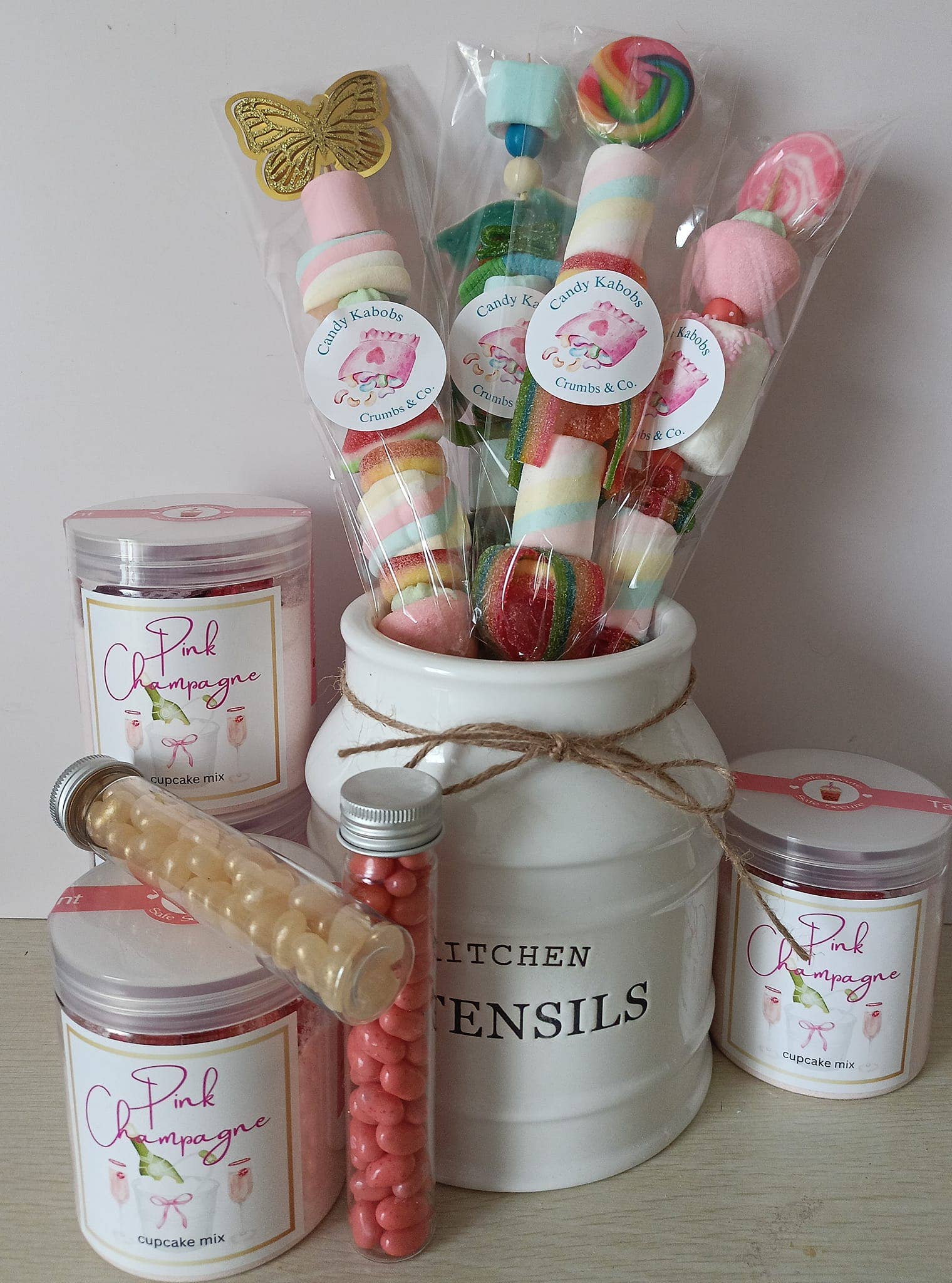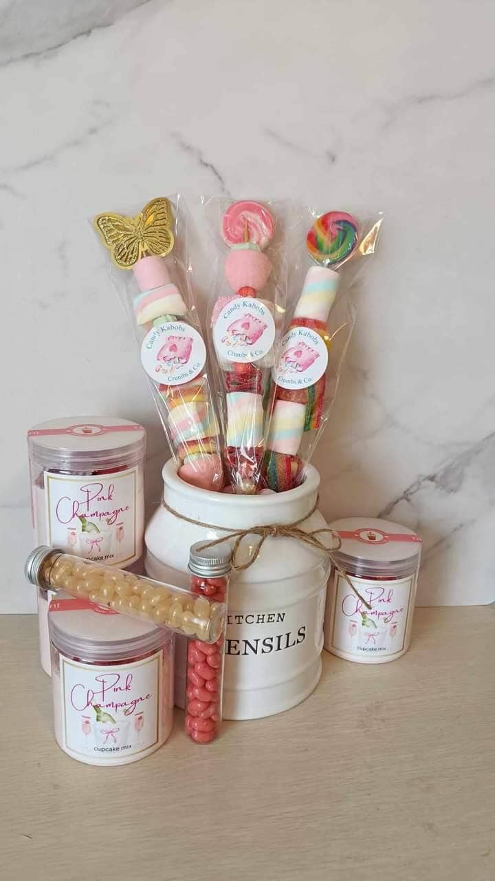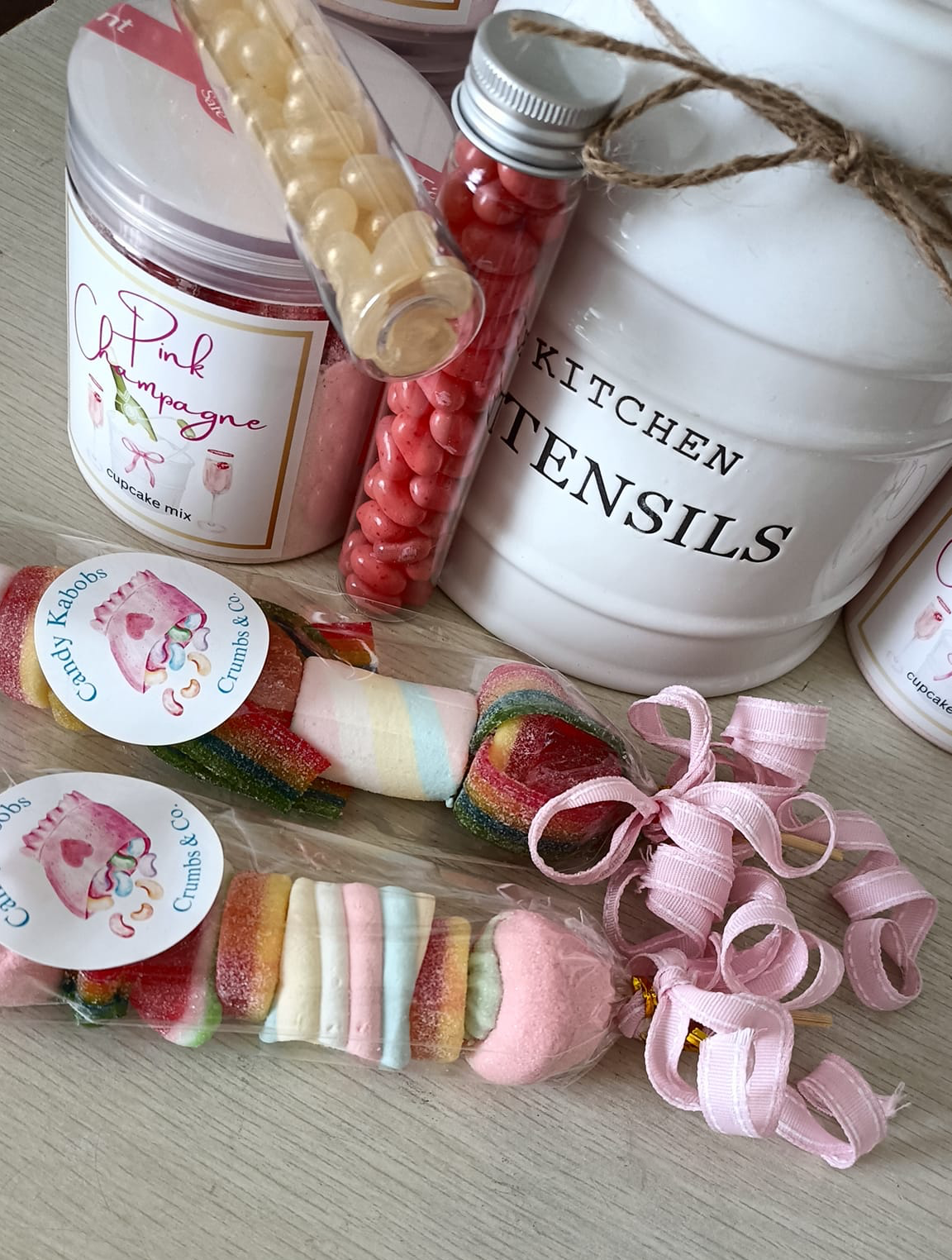 Each are on 11” wood skewers with about 9” of candy. Individually tied with curly ribbon. They are also shelf stable. Holiday themes coming as well. These come in a multi pack of various color hues, marshmallows, lollipops. gum balls and gummy candies.