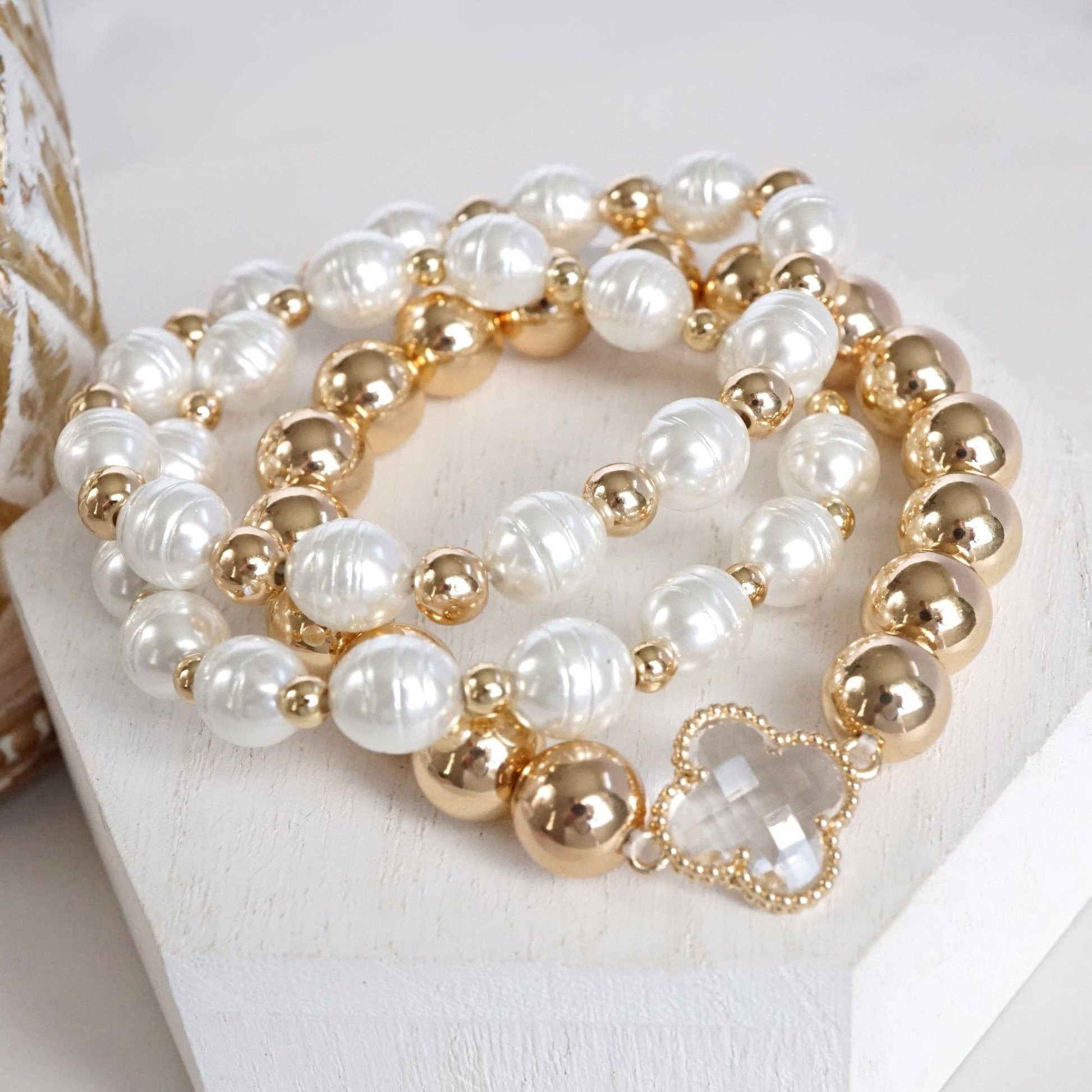 Chunky Beads & Clover Charm Statement Bracelet Set – Bold & Elegant A striking blend of bold textures and timeless charm, this set of three stretch bracelets features lustrous pearlized beads, radiant gold-tone spheres, and a faceted glass clover charm framed in gold. Perfect for making a statement, whether styled solo or stacked for a luxe layered look. Stretchy fit—one size fits most