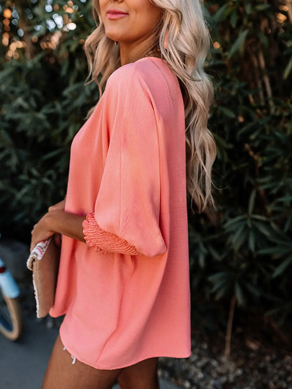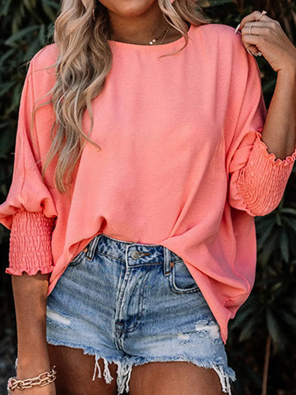 Introducing our Coral Shirred Cuffs Top! Its stretchy smocked cuffs add a touch of style to the sleeves and jewel neckline. Enjoy a relaxed fit and easy pullover style, perfect for pairing with skinny jeans and comfy sneakers.