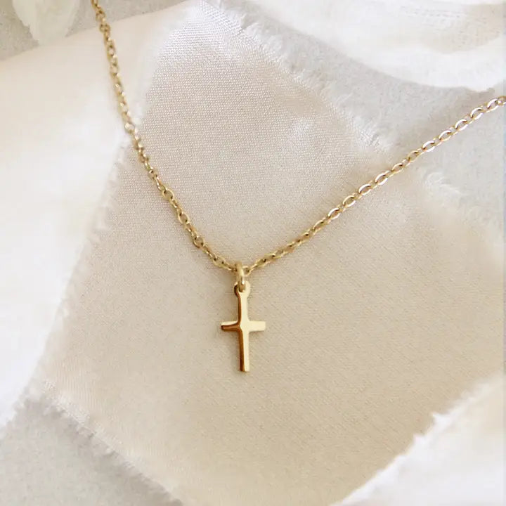 "For the word of the cross is folly to those who are perishing, but to us who are being saved it is the power of God." 1 Corinthians 1:18 • This listing is for one (1) necklace • Lengths: 17" + 2" extender. Lengthens up to 19" • Measurements: 10mm x 6mm charm • Chain: Delicate simple chain • Finish: 18K gold over surgical or polished surgical steel. Tarnish resistant and waterproof. • Nickel Free and Lead Free. Hypoallergenic. • All our jewelry is packaged in signature Love Story Collection by MAIVE gift box.