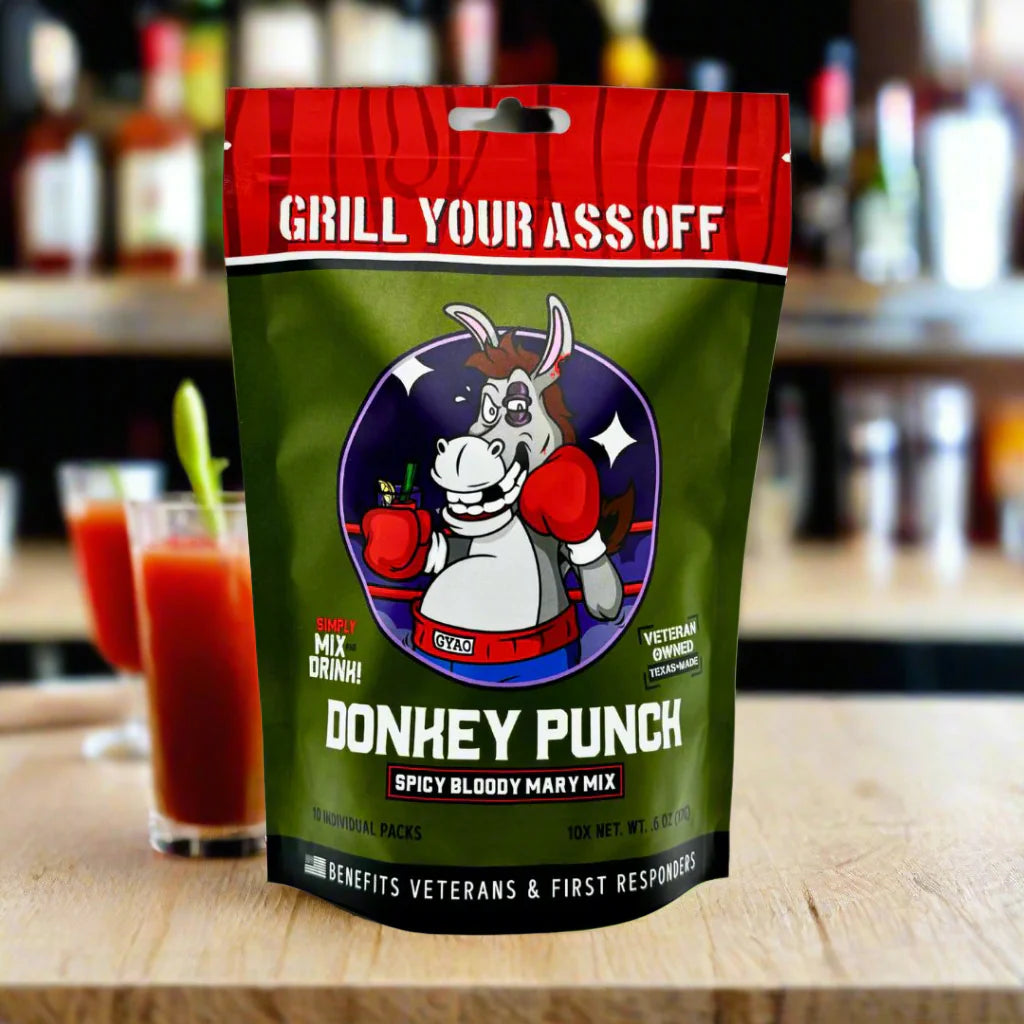 Get ready to kick your brunch into high gear with Donkey Punch Spicy Bloody Mary Mix! This perfectly portioned spice mix has a punch of bold, savory flavor that turns any Bloody Mary into a full-on flavor fiesta. Perfect for those who like their cocktails with a kick!