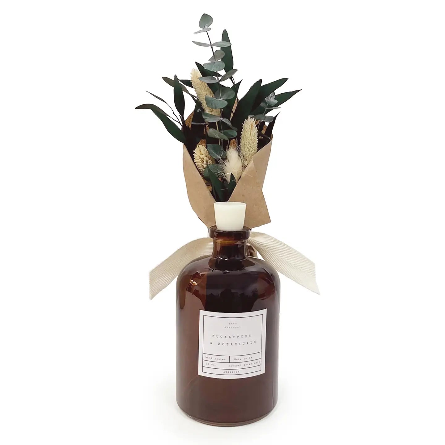 Inspired by the beauty of eucalyptus, we designed this diffuser collection around mini bouquets of eucalyptus and various natural botanicals. The Balsam Vanilla scent is a smooth and sophisticated fragrance that fill your home with a modern scent, while the willow, baby eucalyptus & plumes bundle will add natural beauty. Always hand filled in California. Botanical reed bundle wrapped in kraft paper ships attached to diffuser glass.