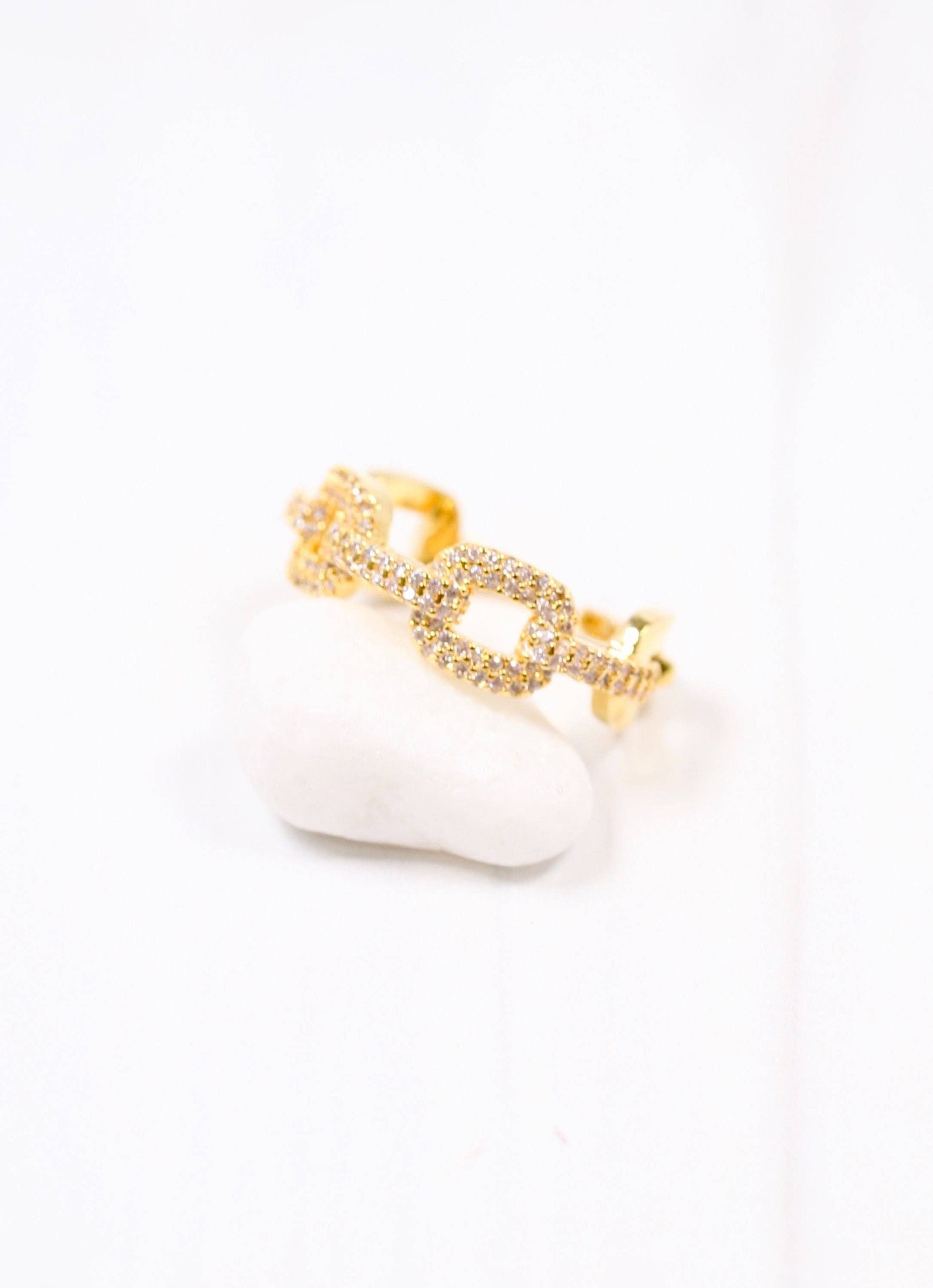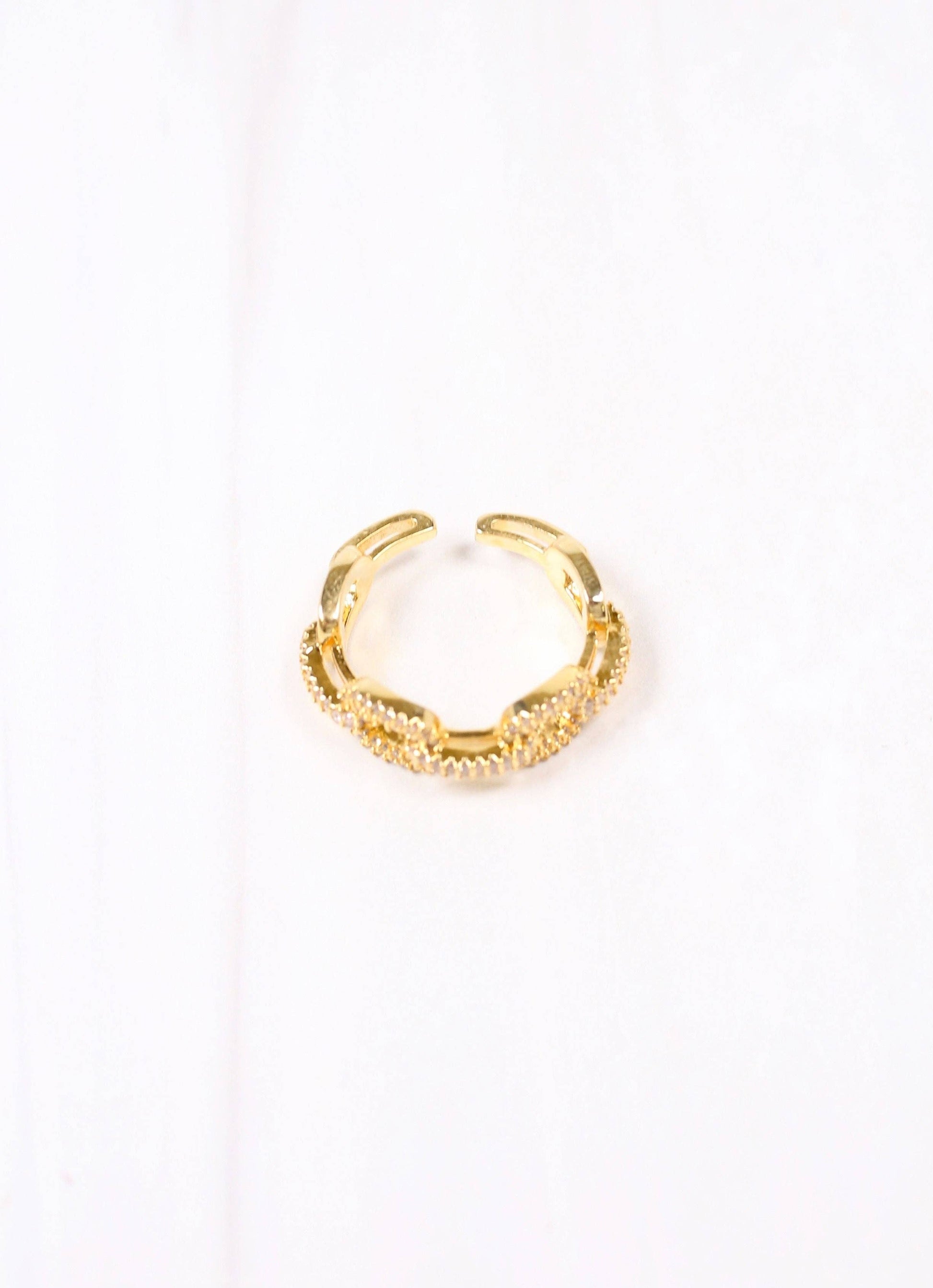 This ring has a chain link design and is covered in sparkly CZs. It is slightly adjustable to fit most ring sizes.