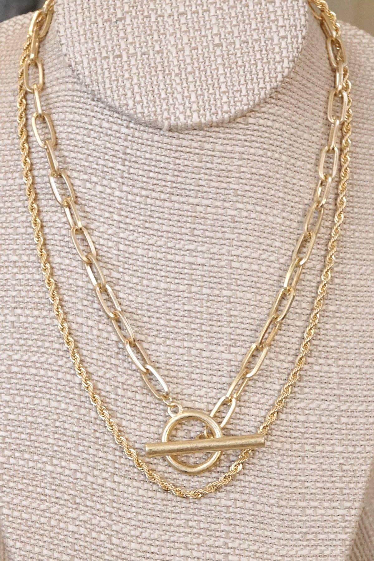 Front Toggle Closure Necklace Multi Layer Chain in Gold tone Fun 2 in 1 piece that is a dress-up dress-down, goes with pretty much everything in your closet. It's minimal, with lots of chick and style. 15" worn gold tone paper clip chain necklace with front toggle closure 18" worn gold tone twisted chain necklace Back lobster claw closure + 2.5" extender