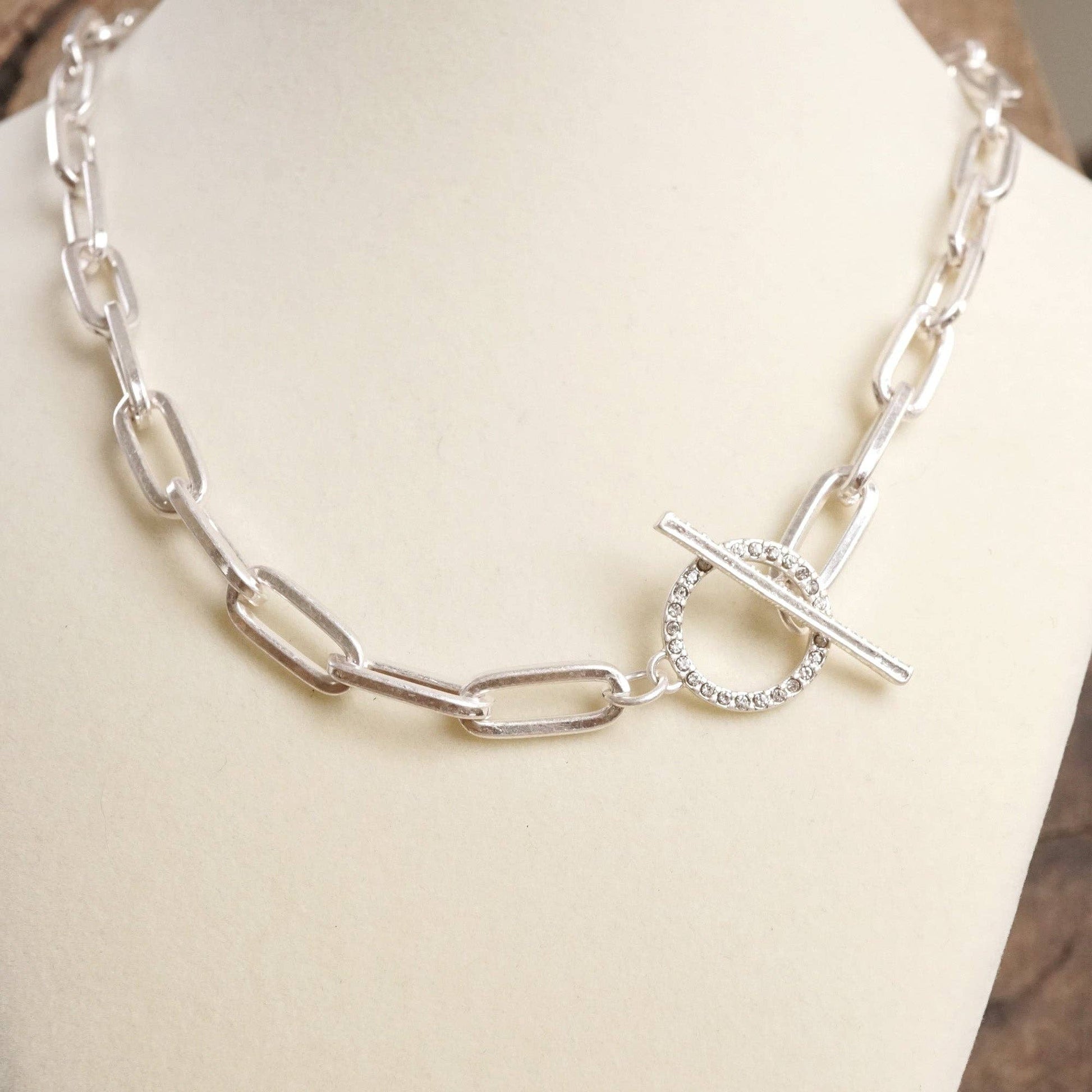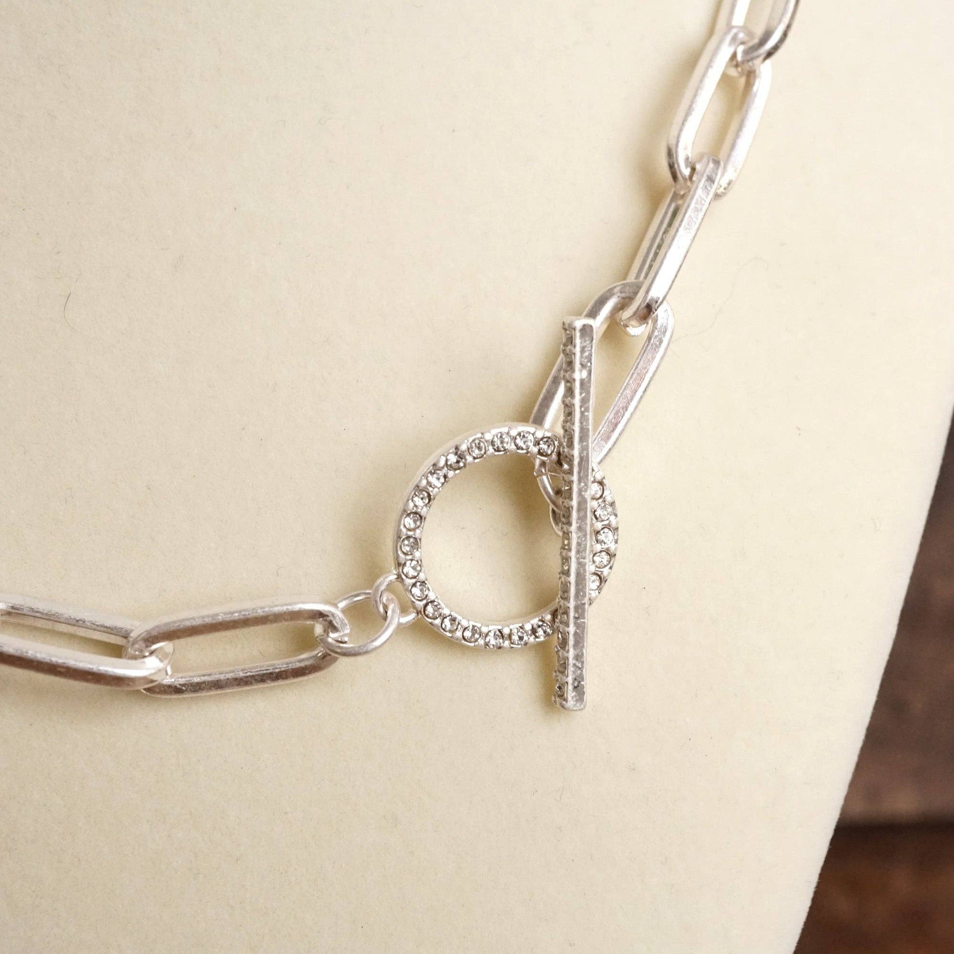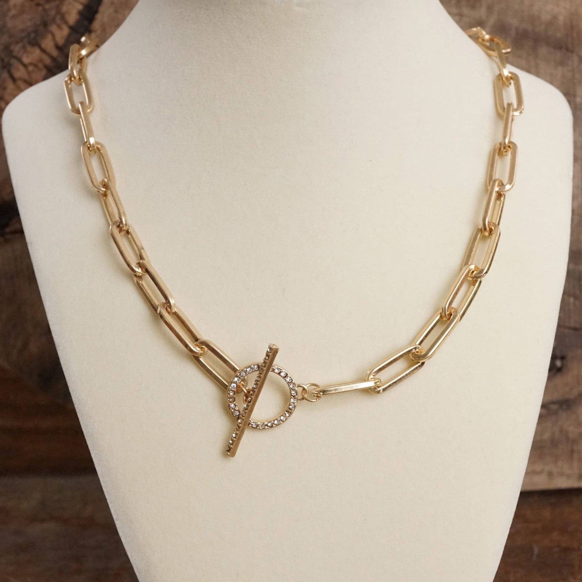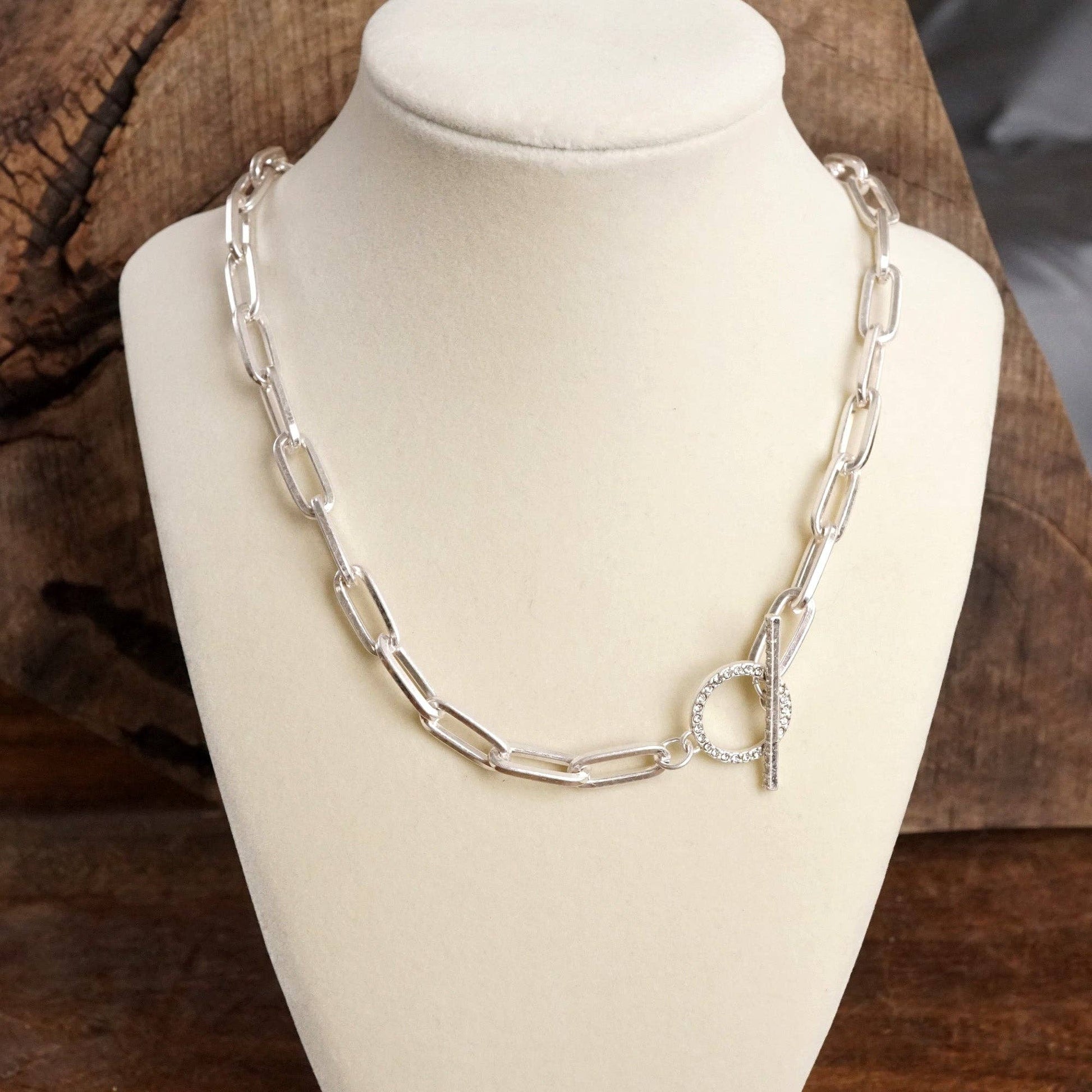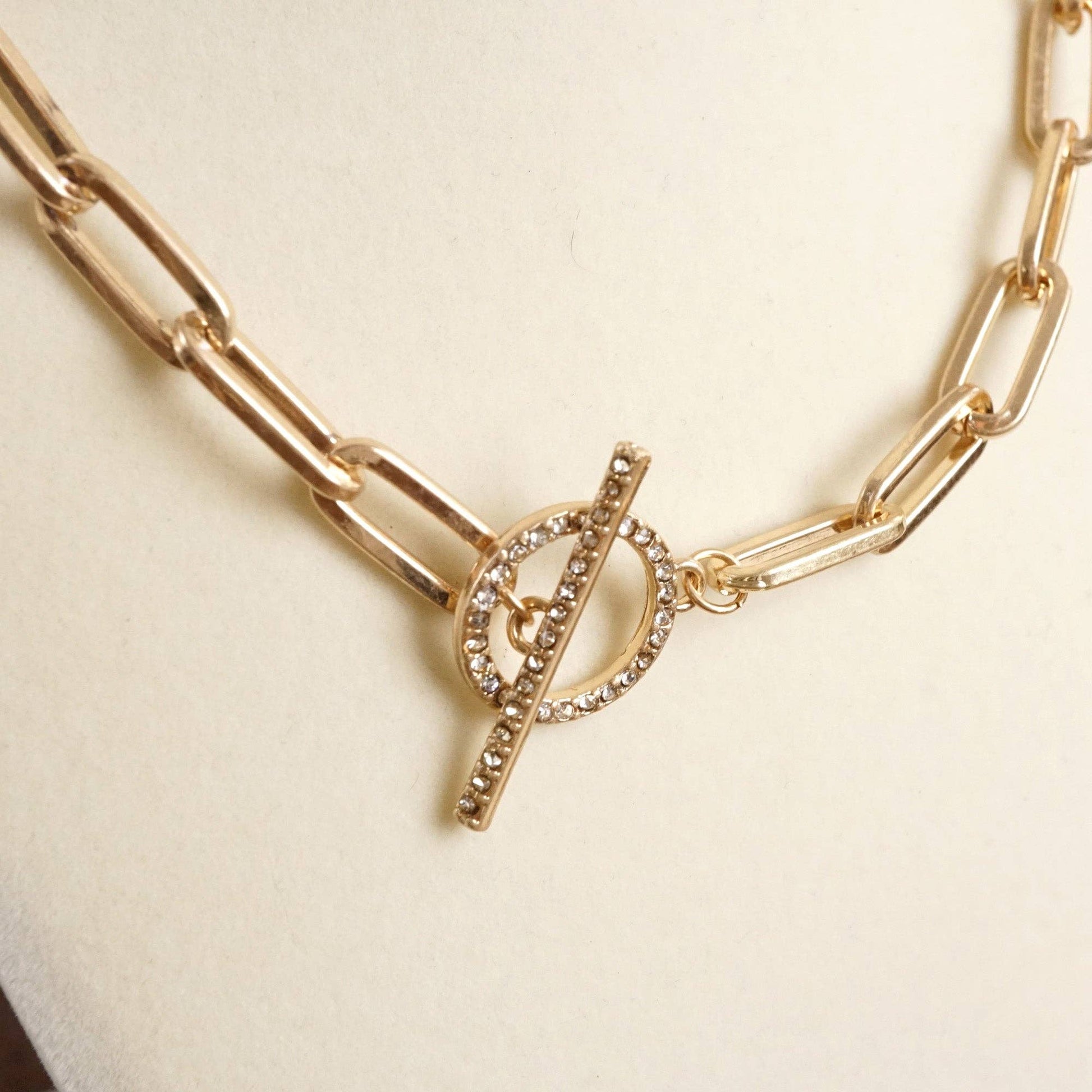 Front Toggle Paved Crystals Paperclip Chain Statement Necklace – Gold or Silver Tone