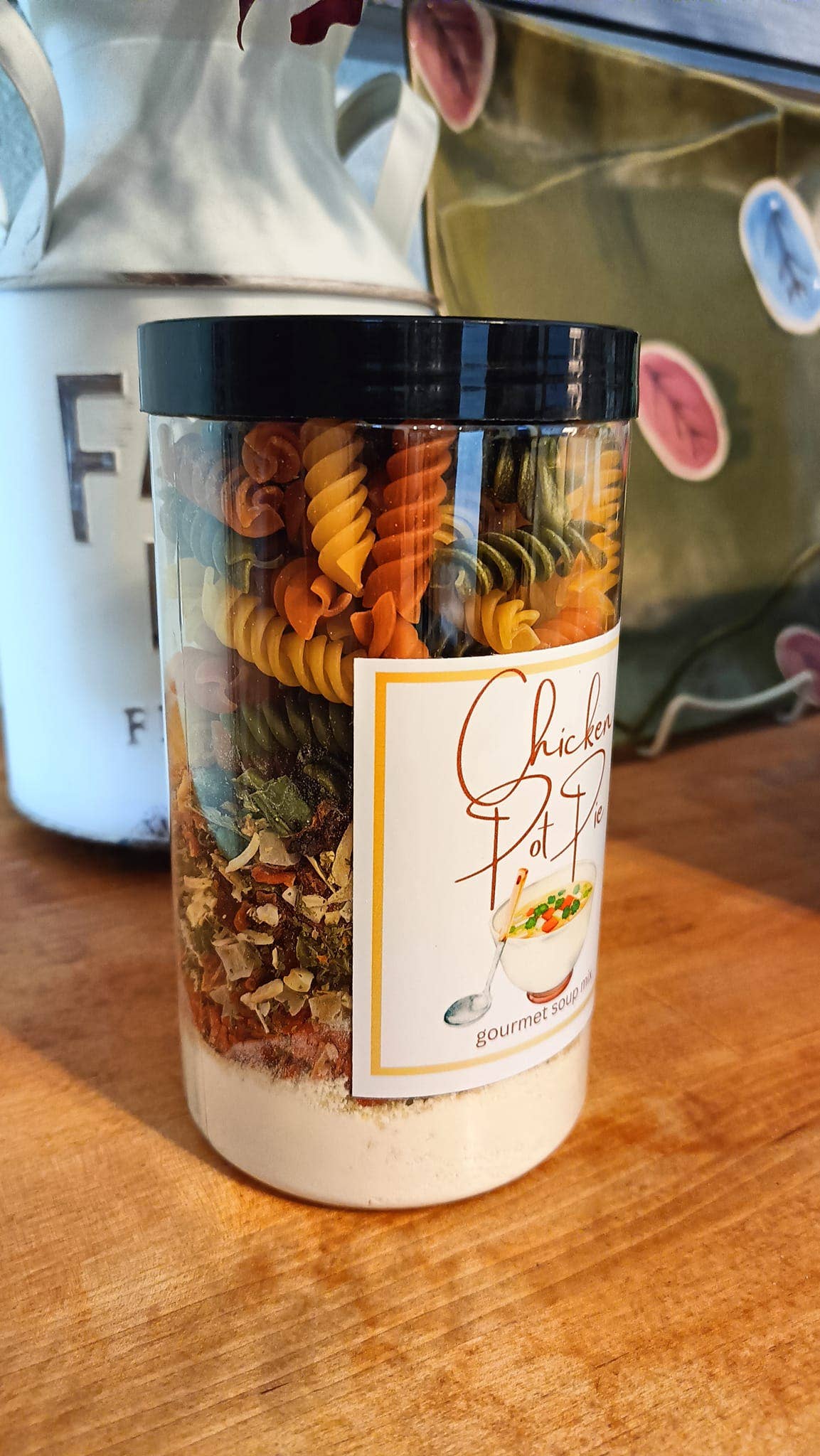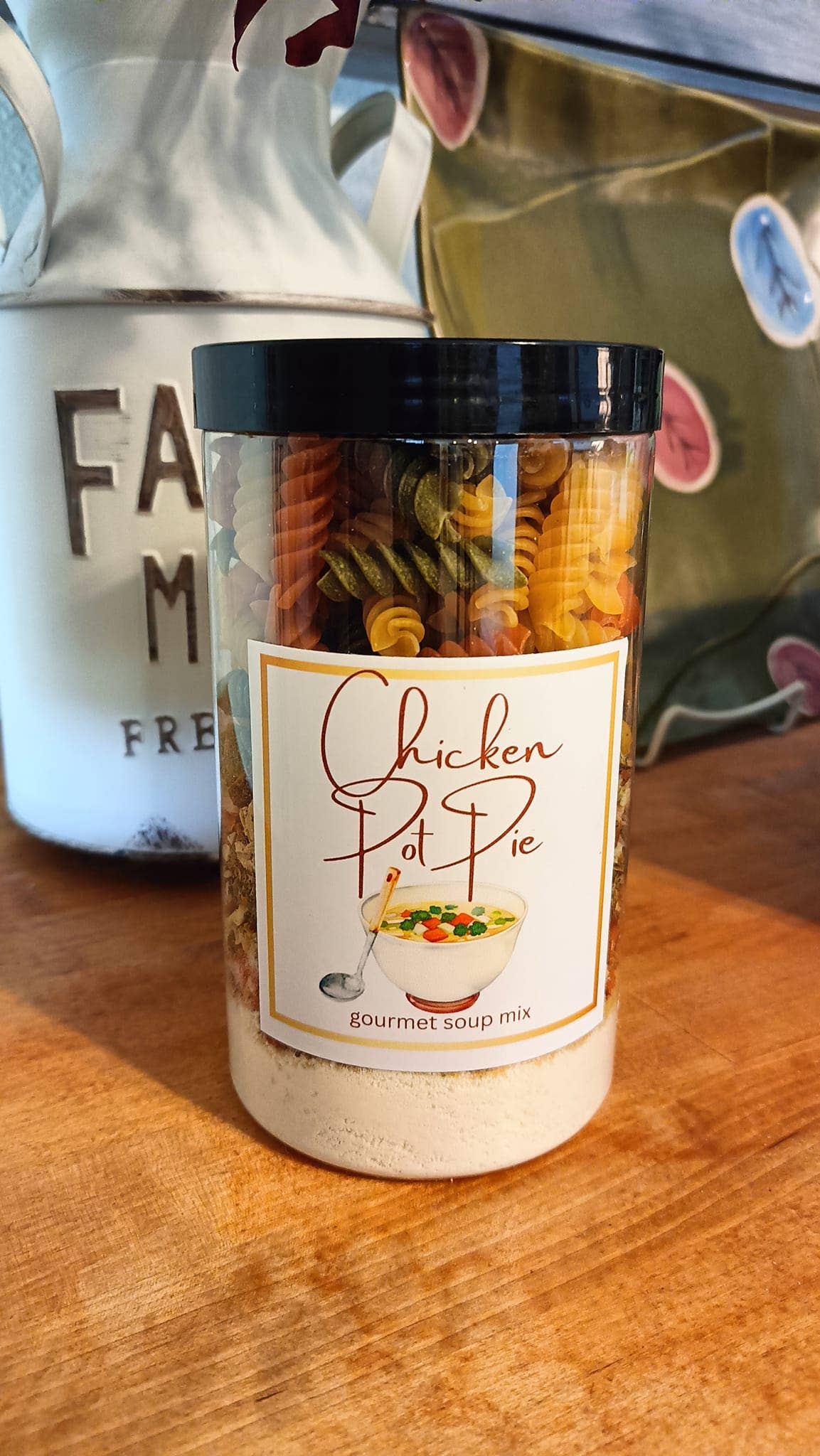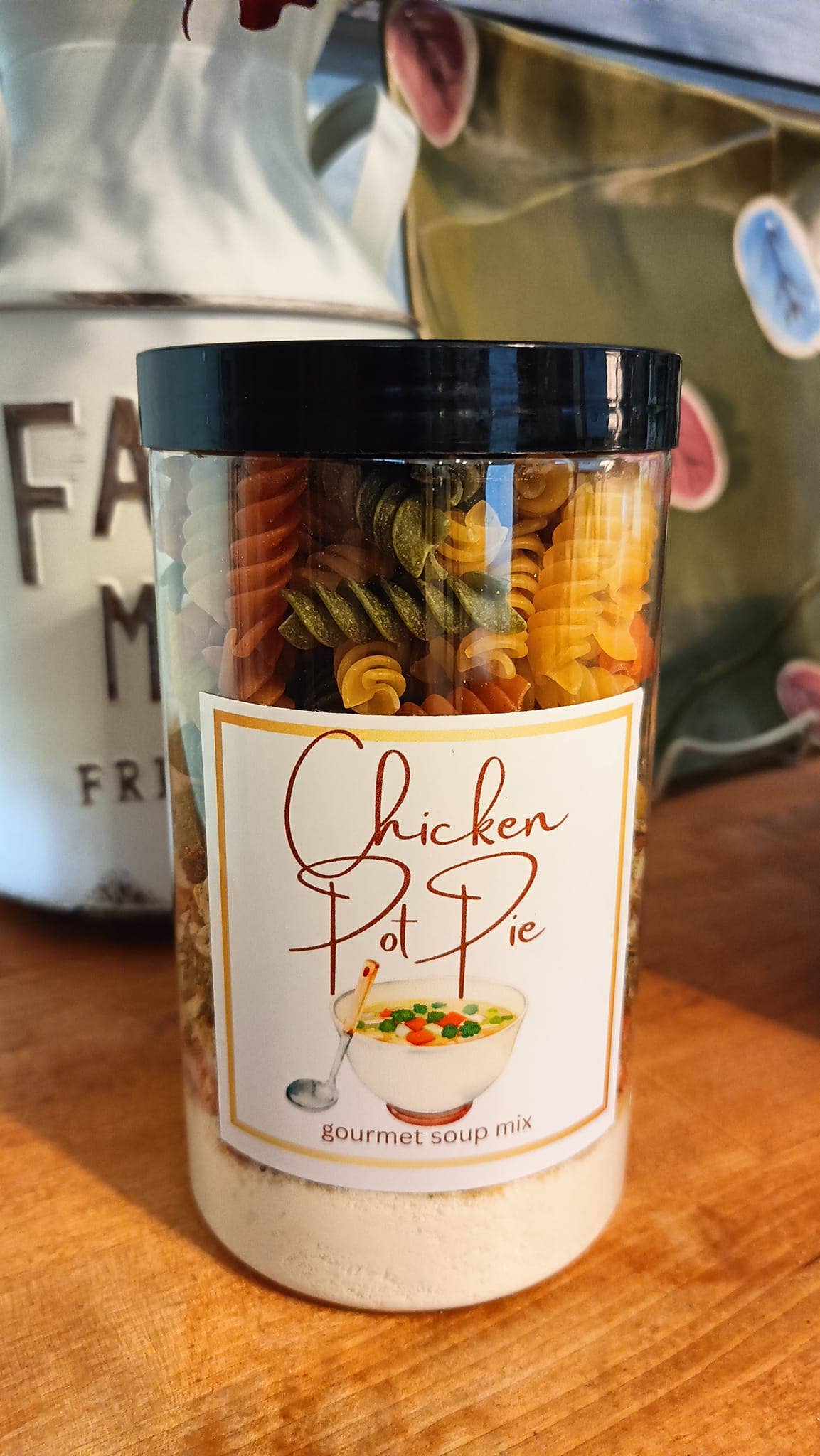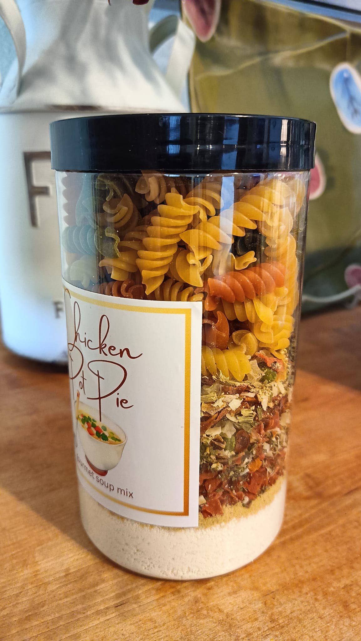 Gourmet Chicken Pot Pie Soup Mix. Beautiful to look and and even tastier to eat. Warm, delicious and loved by everyone. So easy to make. Our jar soups are the perfect lazy, easy meal prep for anytime. Comforting and ready-to-eat soup with minimal effort.