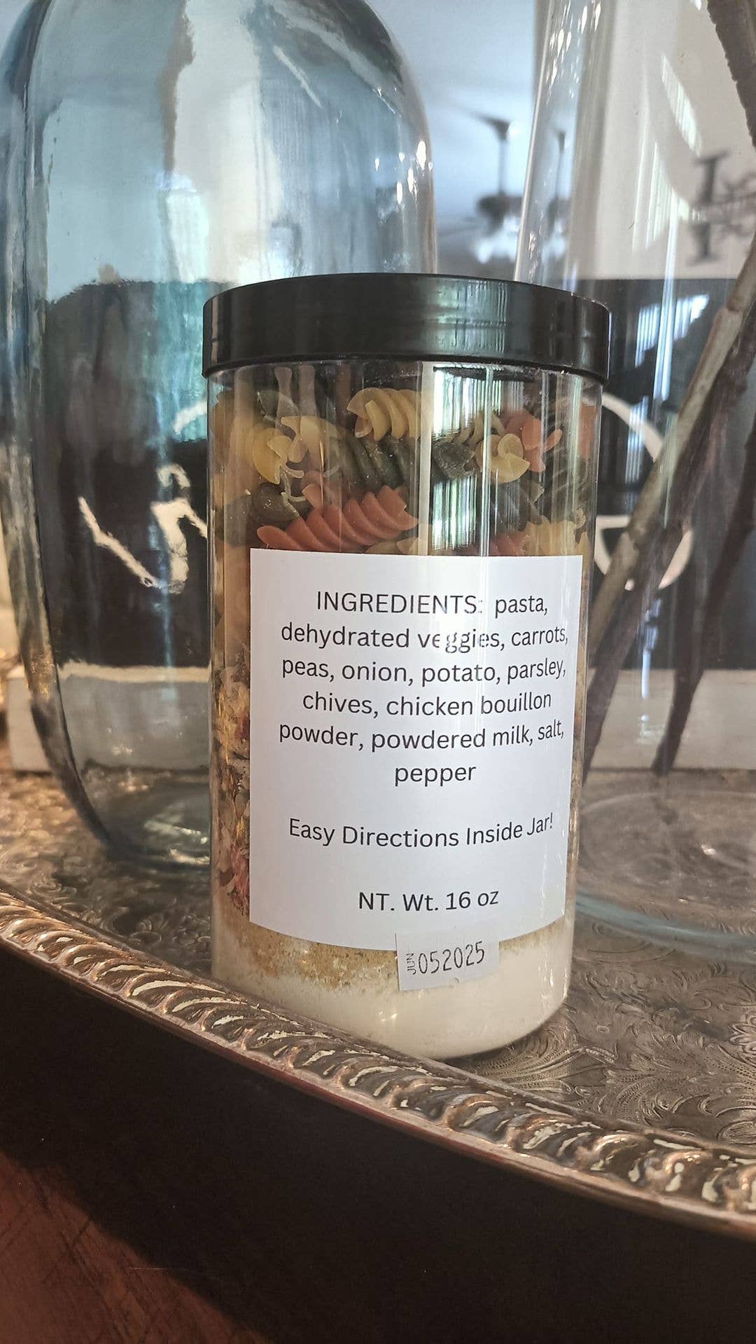 INGREDIENTS: pasta, dehydrated veggies, carrots, peas, onion, potato, parsley, chives, chicken bouillon powder, powdered milk, salt, pepper