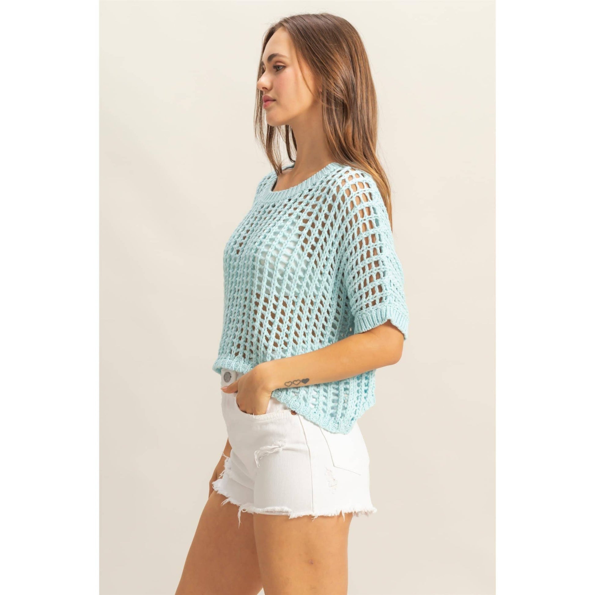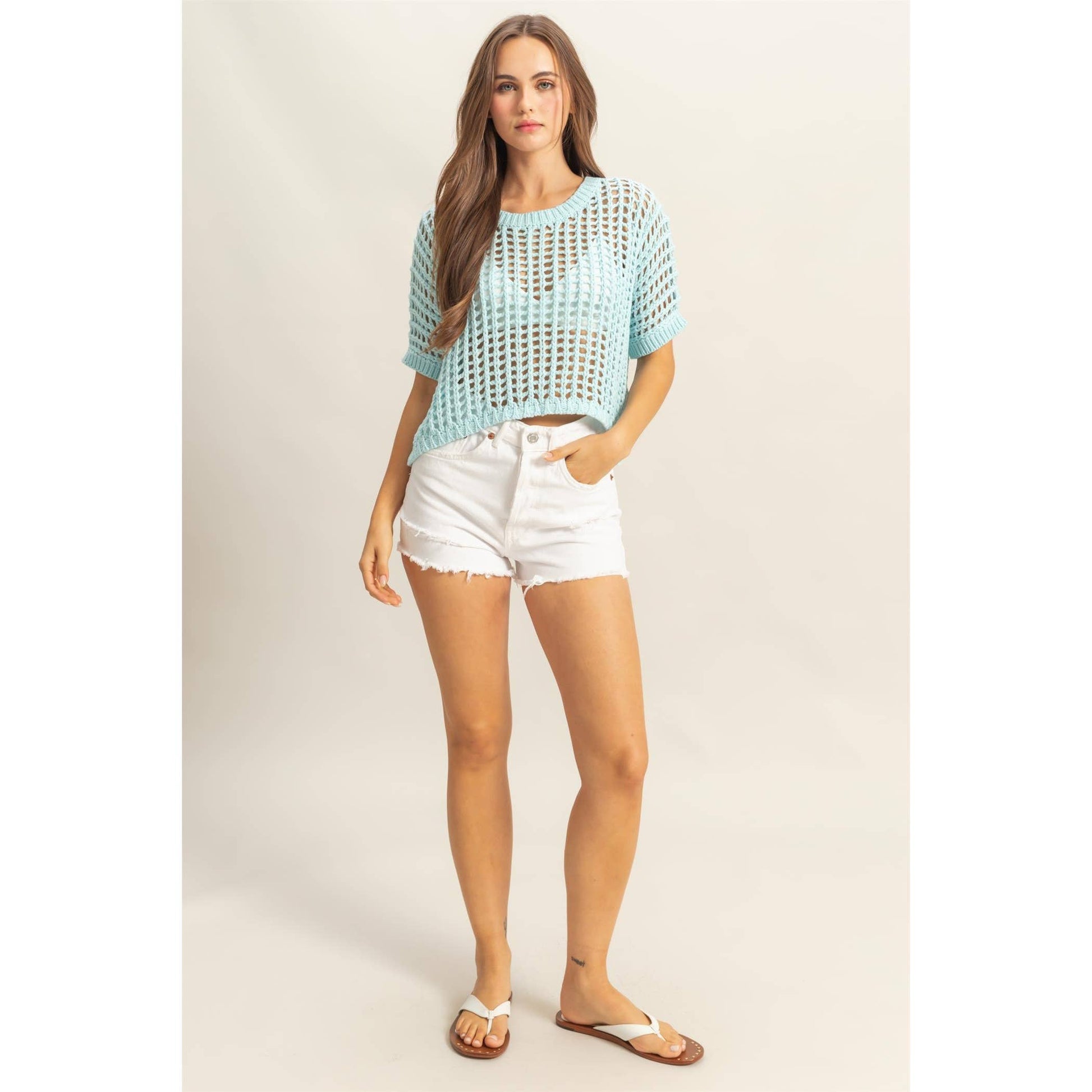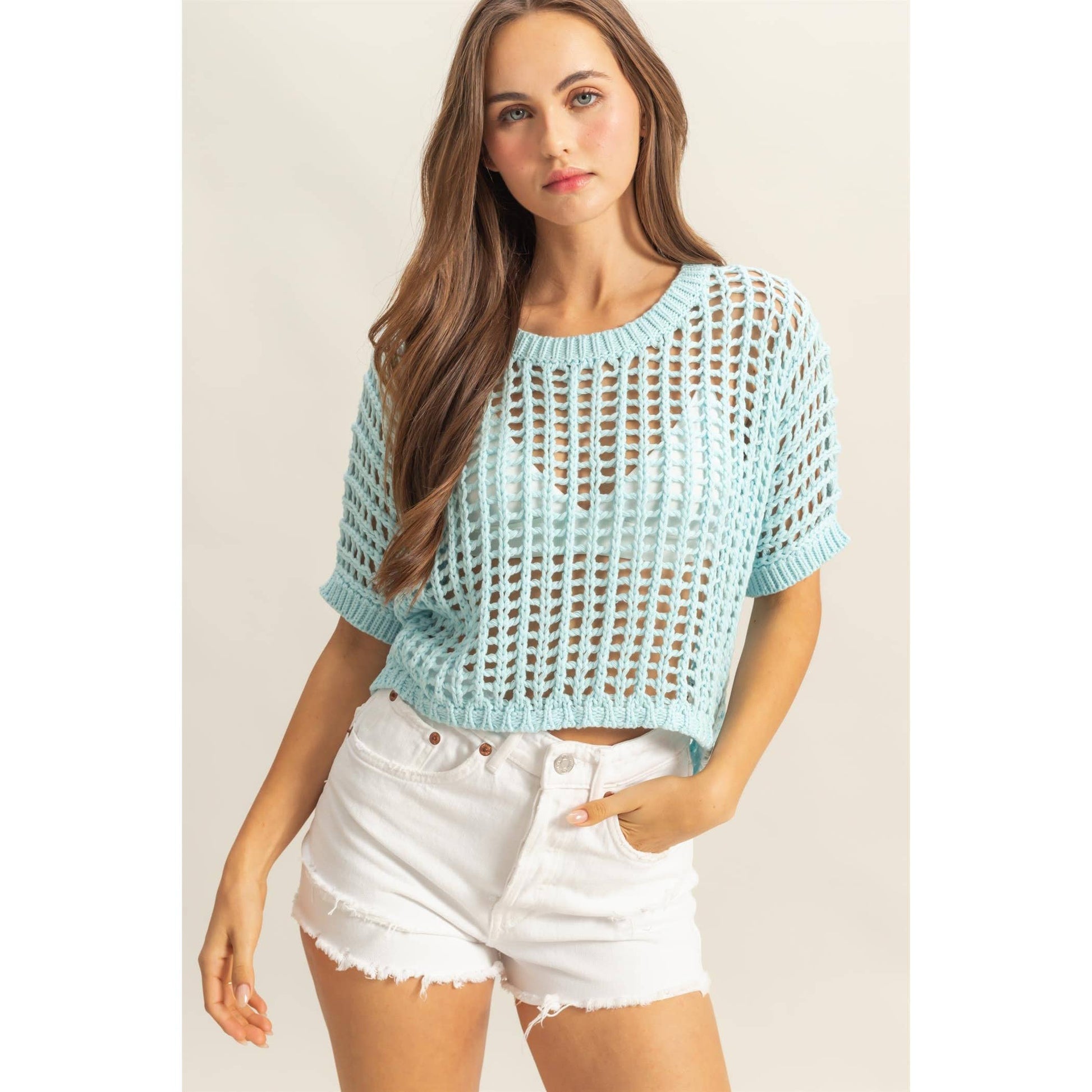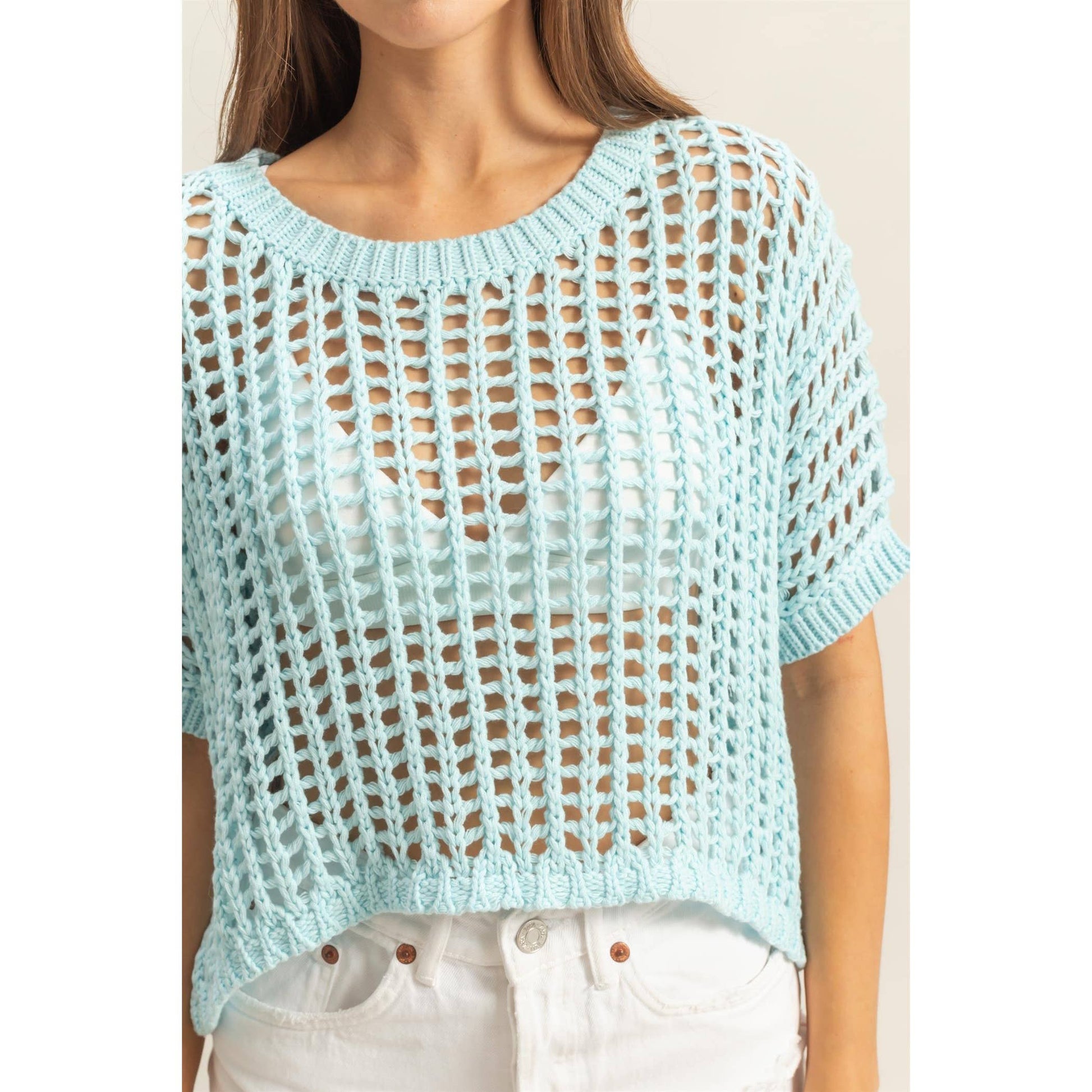 Head to your next beach party in this cool open stitch top. This top has a drop shoulder neckline with short sleeves and a wide cut fit.