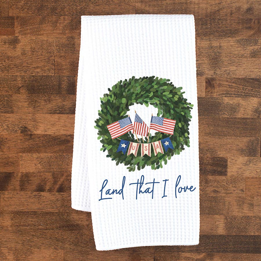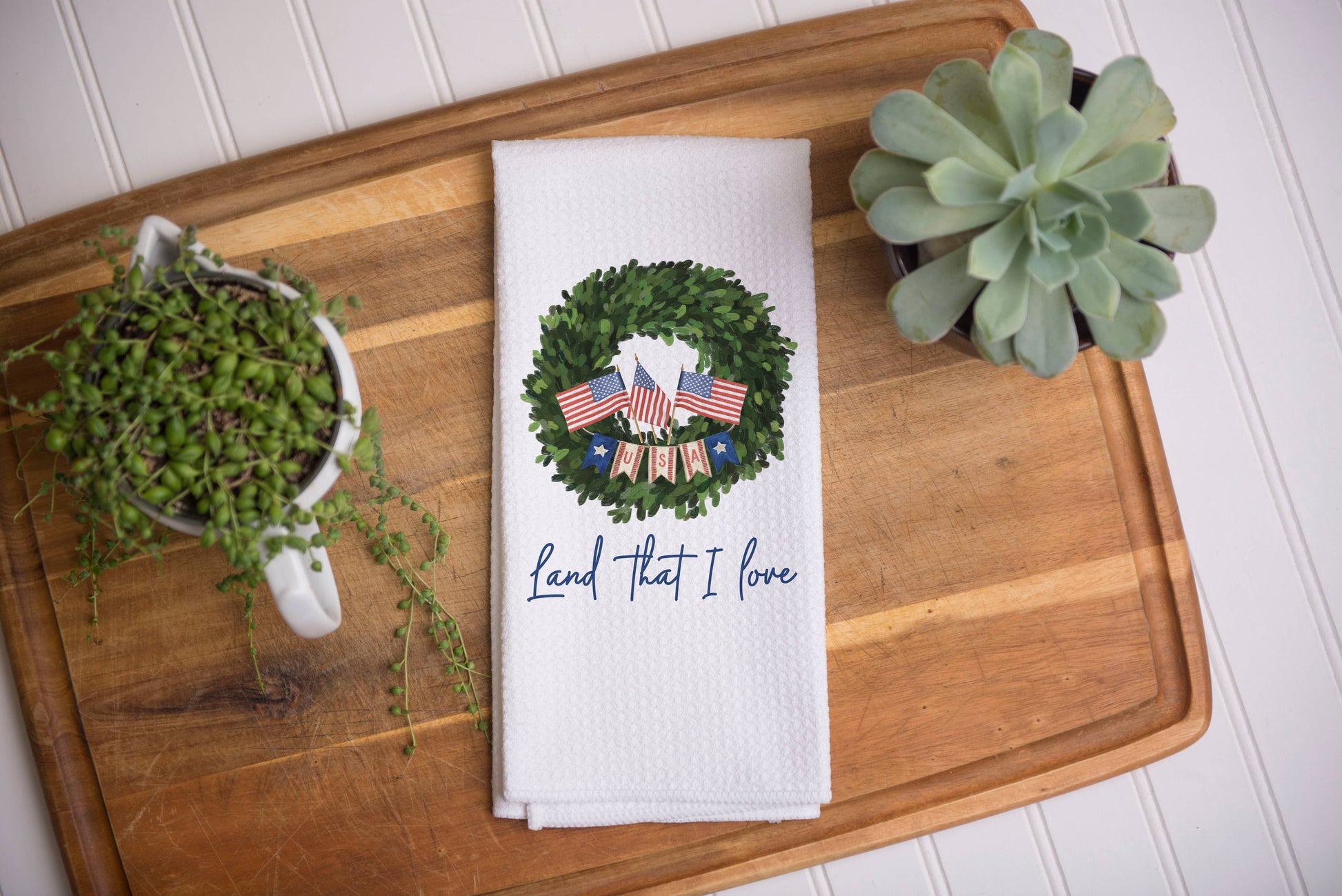 This Land That I Love tea towel is the perfect addition to your red, white and blue patriotic home and kitchen decor, and also makes a great holiday gift. - Measures approximately 16”x 24” - Made of 80% Polyester and 20% Polyamide. - Design is permanently printed - Individually packaged in cellophane sleeve and ready to be gifted - It is called a waffle weave because the towel has raised looped edges on the surface of the towel in the shape like that on a delicious Belgian Waffle. These “pockets'' that are created hold water while the surface of the cloth stays dry making it an exceptional drying towel! The raised looped edges on this lint free towel make it great for all around use, while also being great on glass.