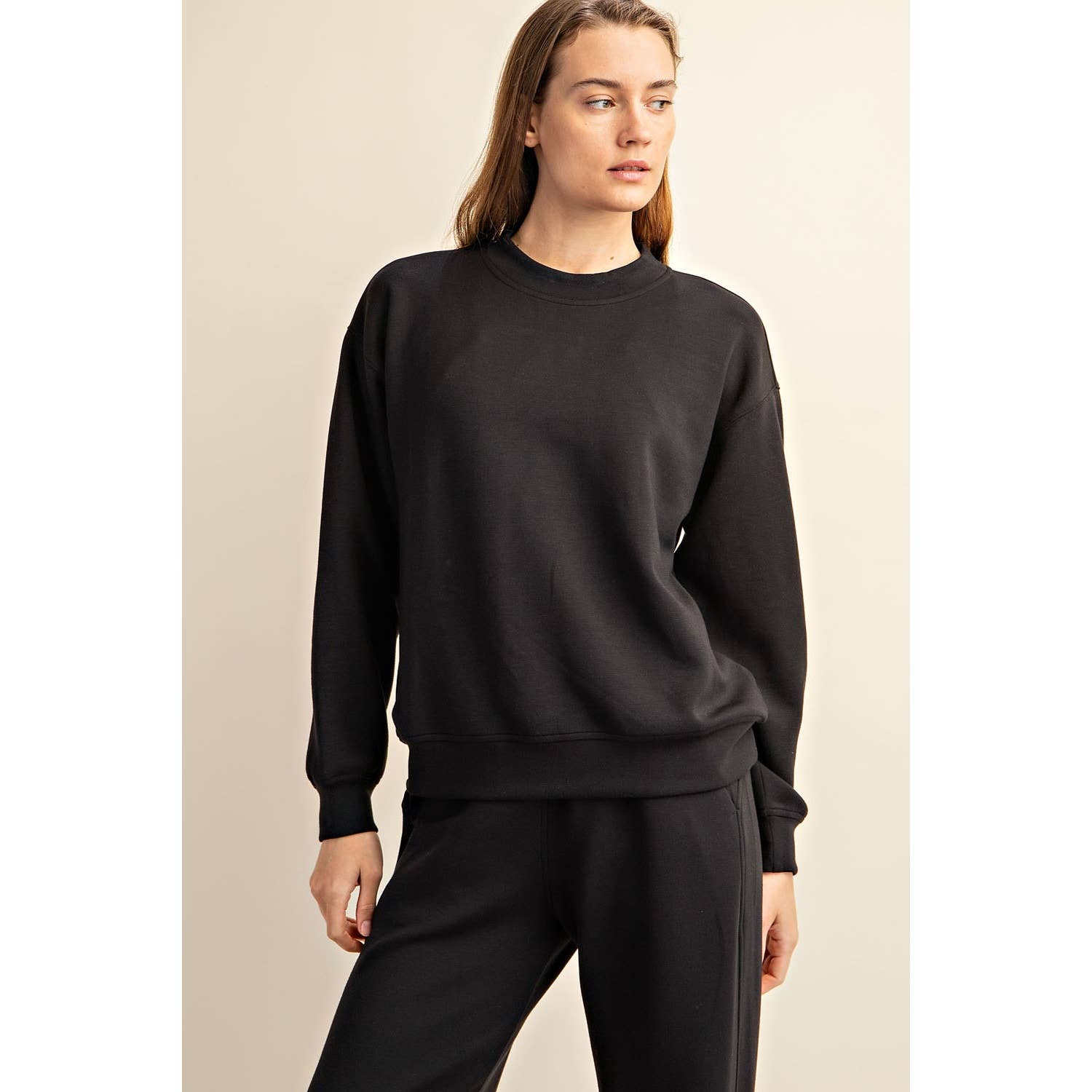 Rae Mode-black mock neck pullover. Crafted from silky smooth and lightweight Modal Scuba fabric. With an oversized fit, it's perfect for relaxation and lounging, indoors or out. Ideal for cozy moments at home or casual outdoor outings, this pullover effortlessly combines comfort and style for any occasion.