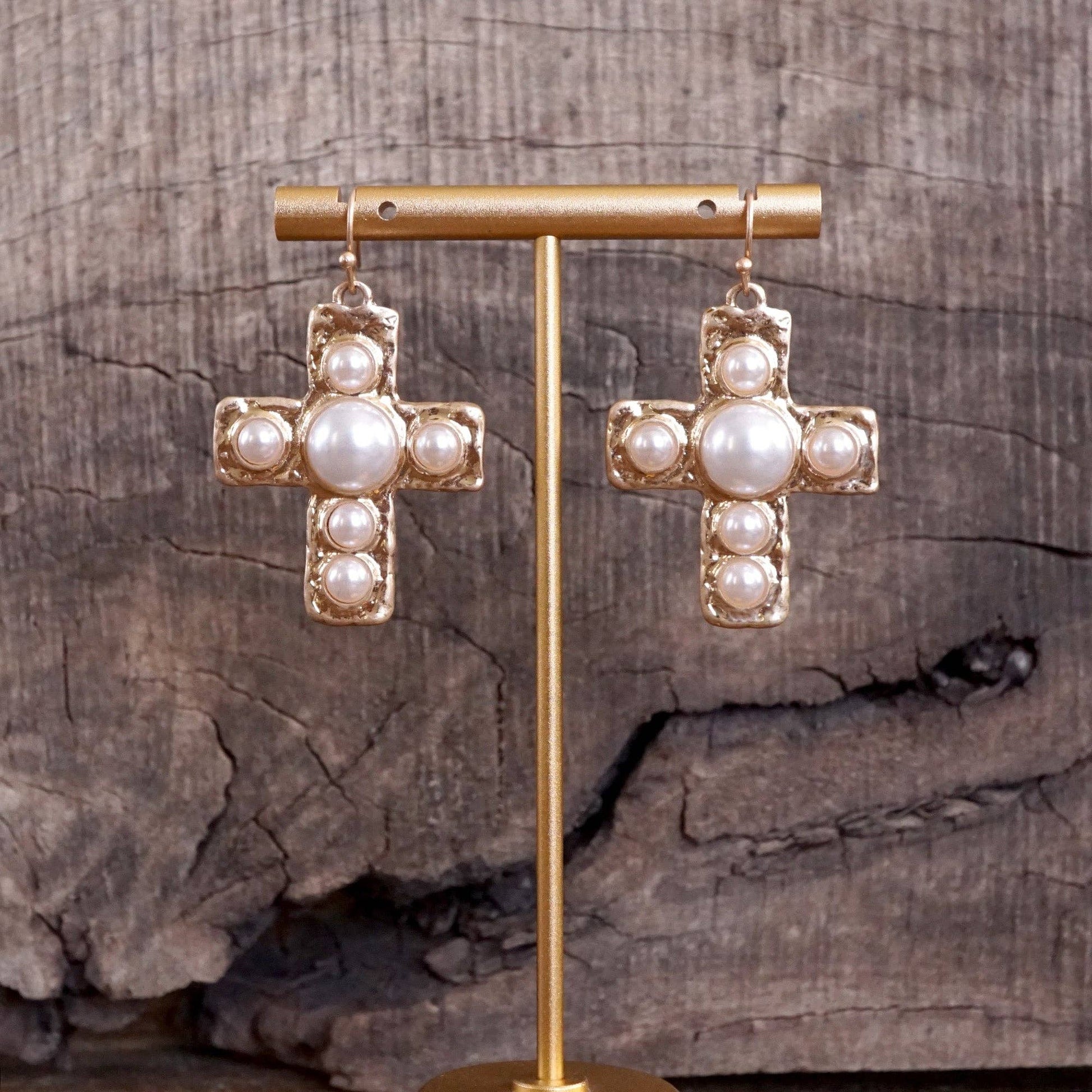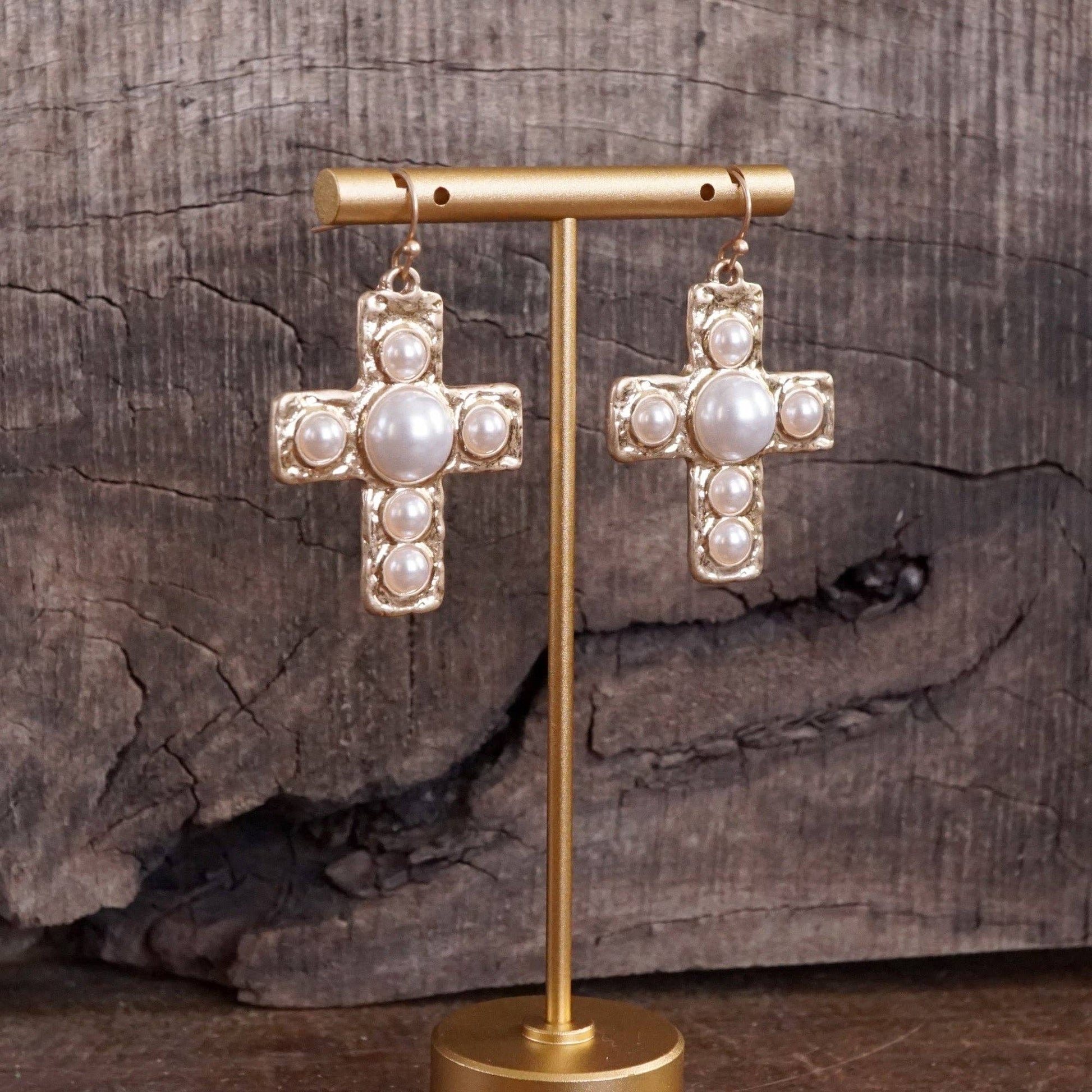 Primitive Cross Earrings – Worn Gold with Pearl Striking yet grounded, these primitive-style cross earrings bring a vintage touch with smooth cabochon accents in soft pearl or bold turquoise. Designed with worn gold, fishhooks for an easy, graceful drop. Matching bracelets and necklaces are available separately. 1.5" worn gold-tone primitive cross