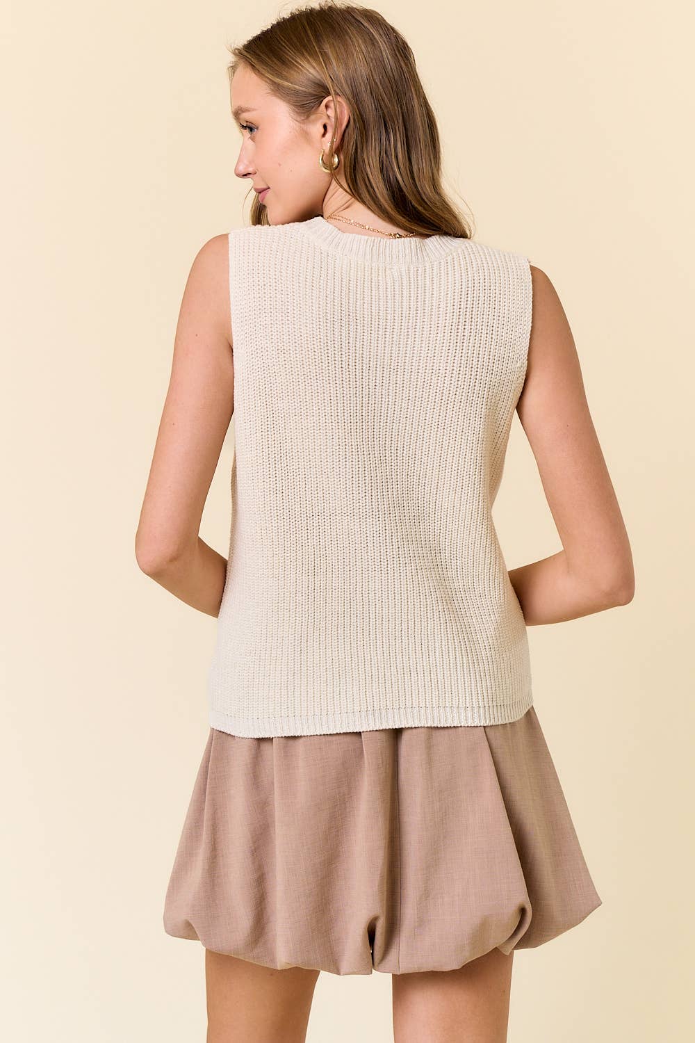 ROUND NECK "BEACH" SWEATER TANK TOP - Sleeveless knit sweater tank top with "Beach" text embroidery - Round neckline with ribbed trim - Ribbed knit construction throughout
