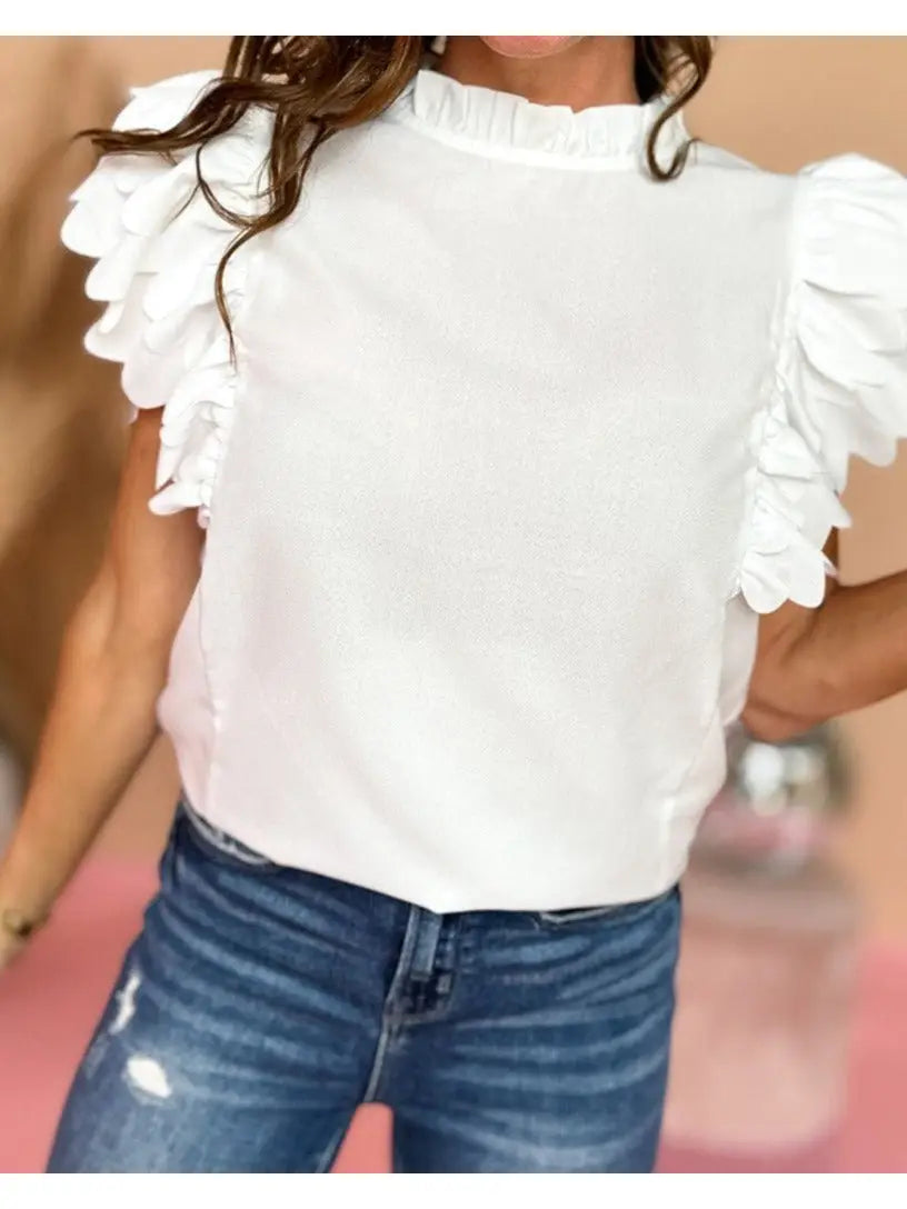 This ruffle top features a frilled neckline that adds a romantic touch and a solid color for versatile styling. The timeless design can be dressed up or down for any occasion, while the ruffle sleeves add volume and dimension to your arms for a polished look. 100% Polyester