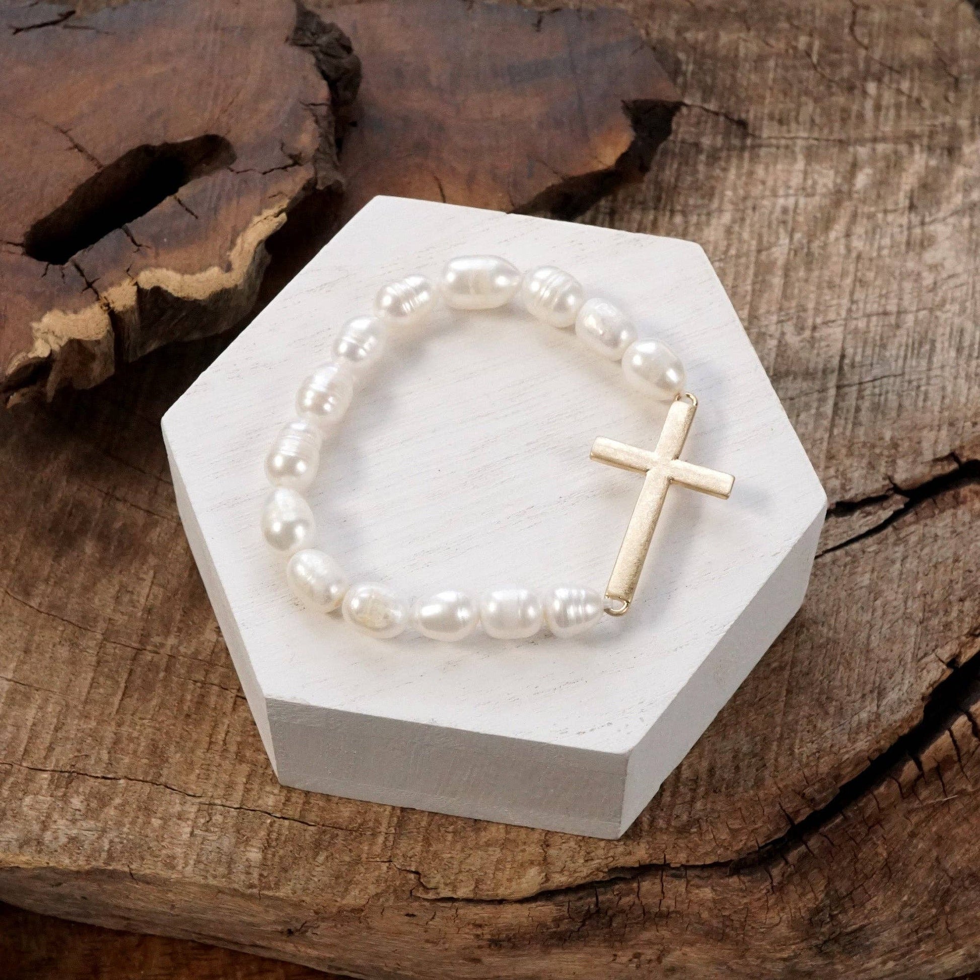 Sideways Cross bracelet Pearls worn gold tone minimal style