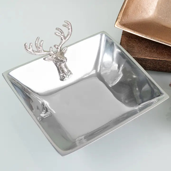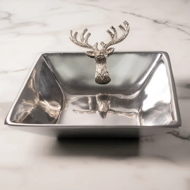 The Polished Silver Deer Square Bowl is a stunning addition to any home decor. Crafted with precision and elegance, this serverware piece is perfect for serving your favorite dishes in style. Made from high-quality aluminum, it features a polished silver finish that adds a touch of sophistication to any table setting. The square shape of the bowl adds a modern twist to its design, making it a versatile piece that can be used for both everyday meals and special occasions. The intricate deer motif on the bowl adds a seasonal touch, making it a perfect choice for holiday gatherings or nature-inspired themes. Whether you're hosting a dinner party or simply enjoying a meal with your family, this silver deer bowl is sure to impress your guests and elevate your dining experience.