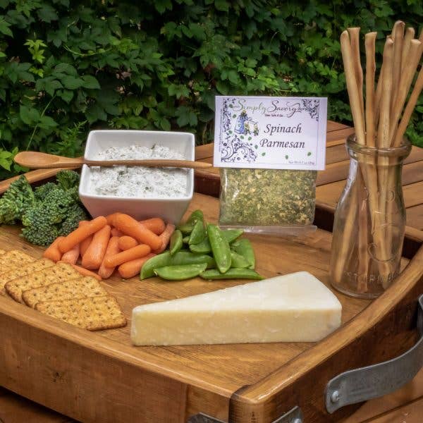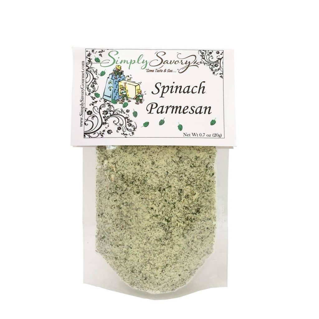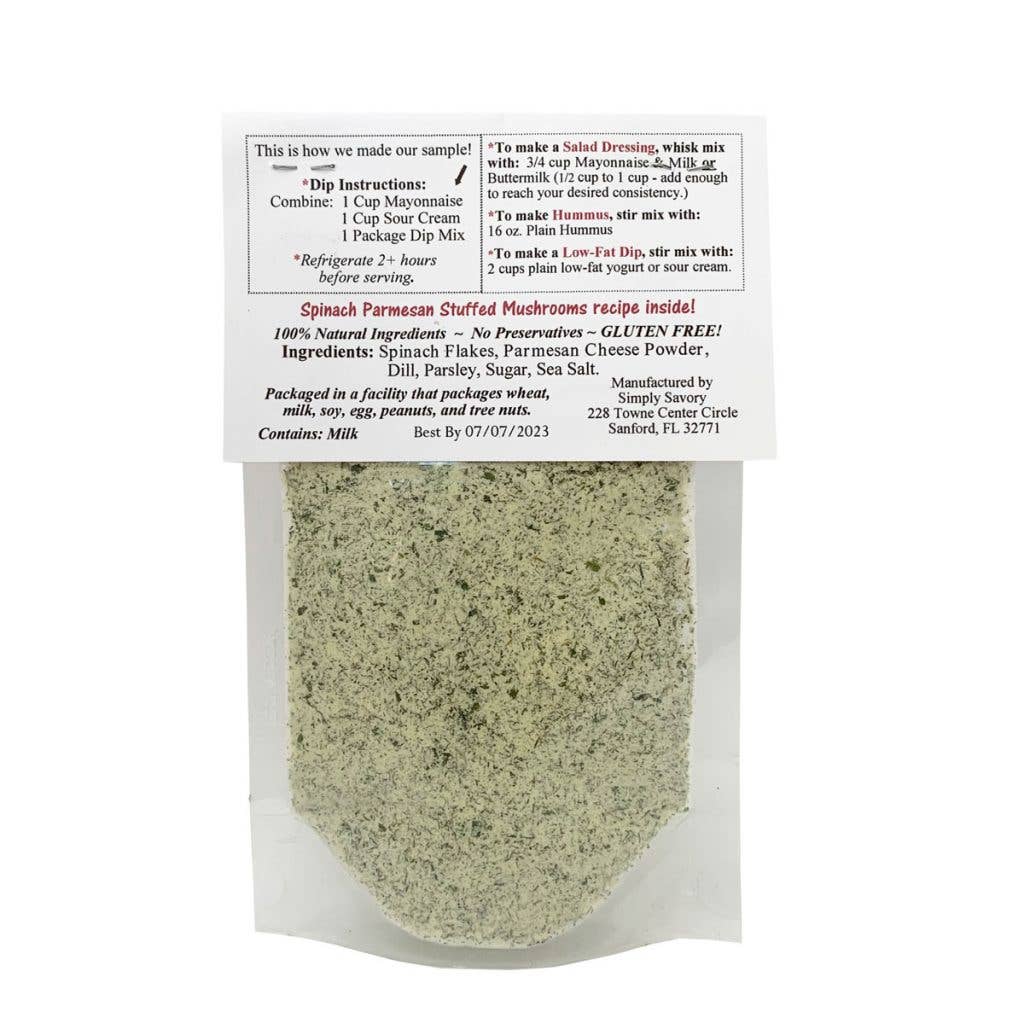 Garden spinach meets the goodness of parmesan cheese in Simply Savory's Spinach Parmesan Dip Mix. Try our stuffed mushroom recipe! Mix package with one cup of sour cream and one cup of mayonnaise, or mix with 2 cups of plain Greek yogurt or 2 cups of plain hummus.