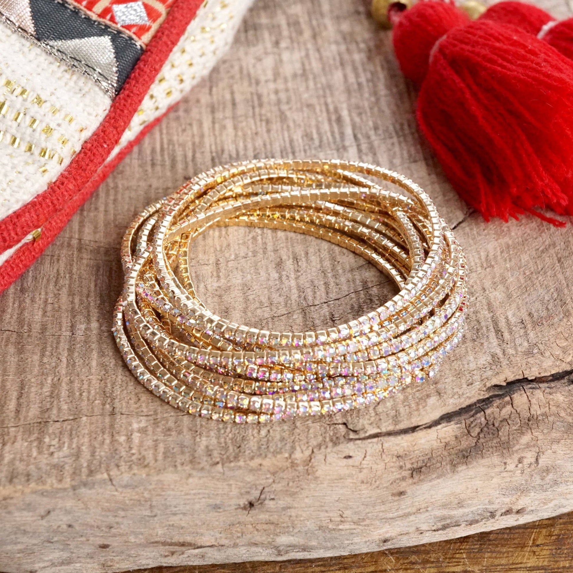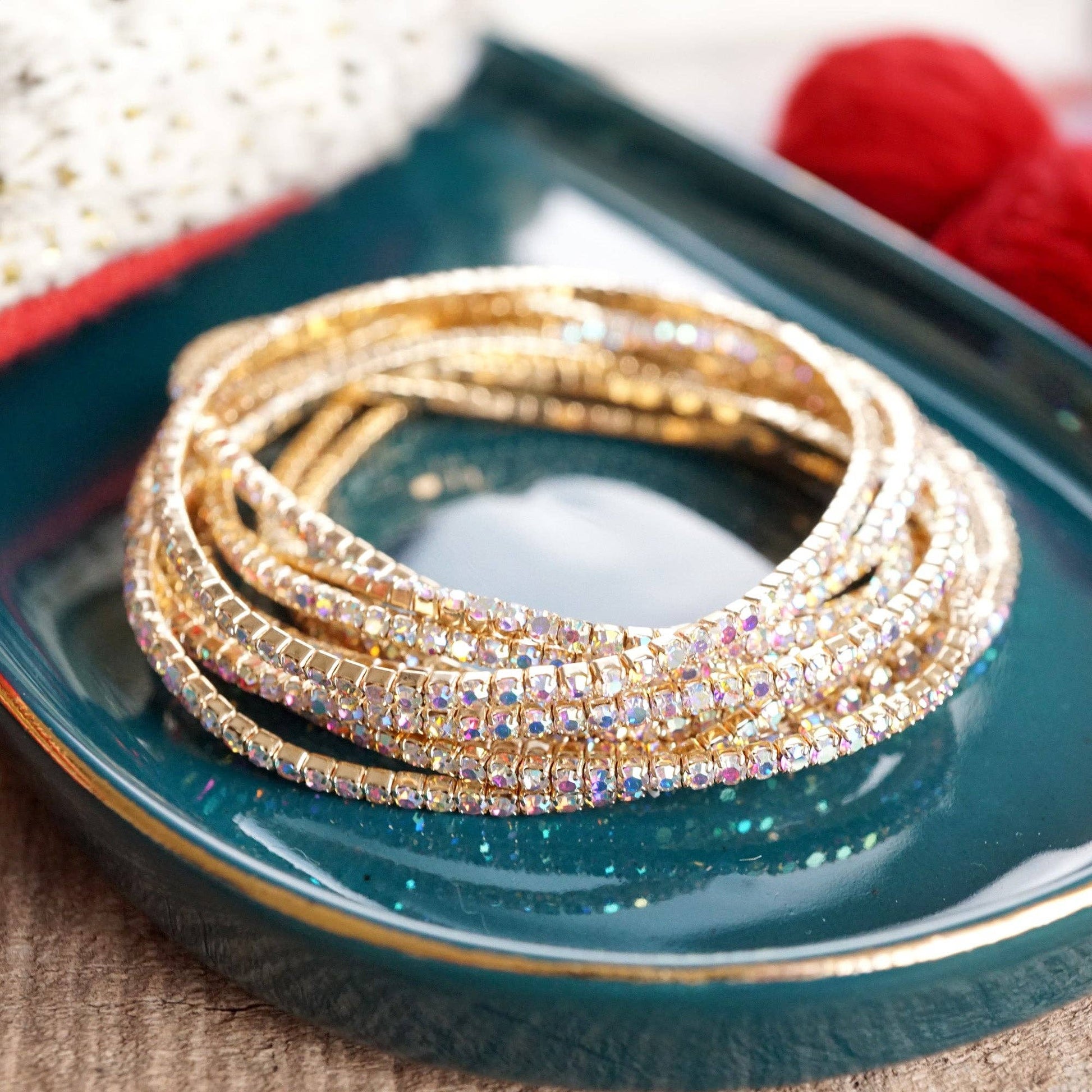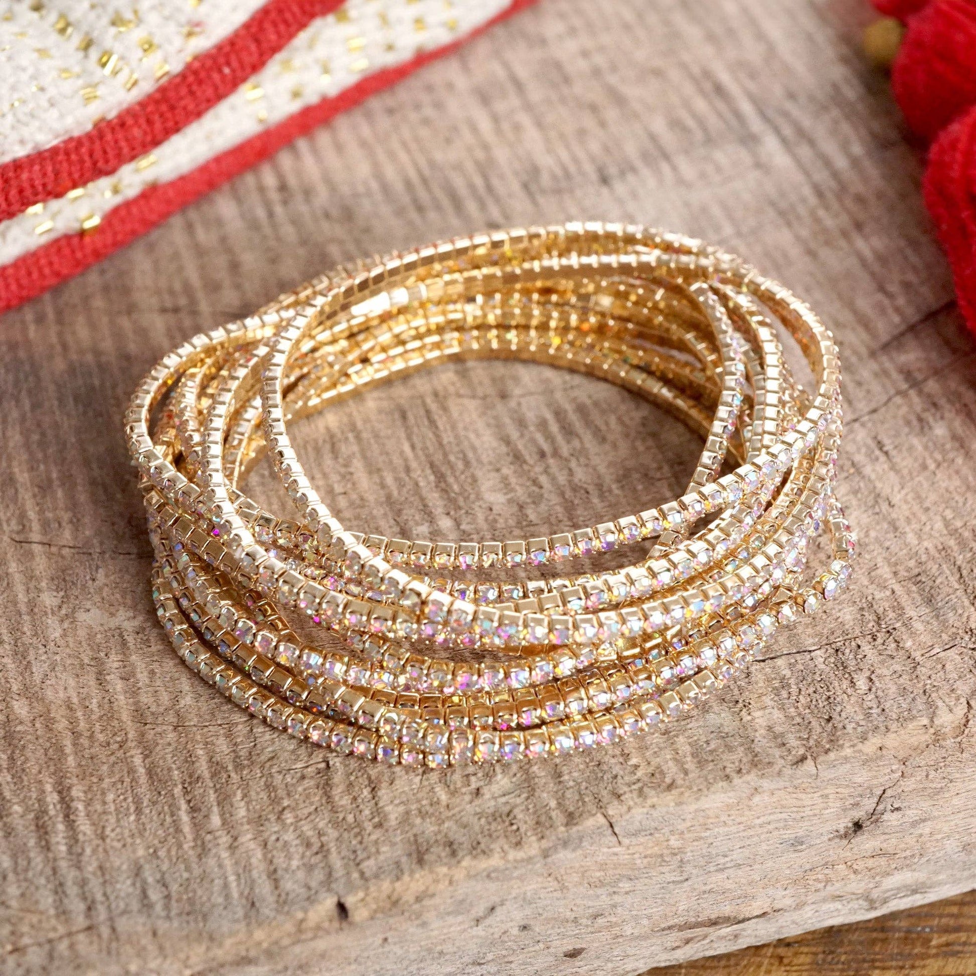 A sparkling set of 12 gold-tone stretchy bracelets with iridescent rhinestones. These super-sparkly pieces are perfect for stacking and add an elegant touch to any celebration, party, or holiday outfit.