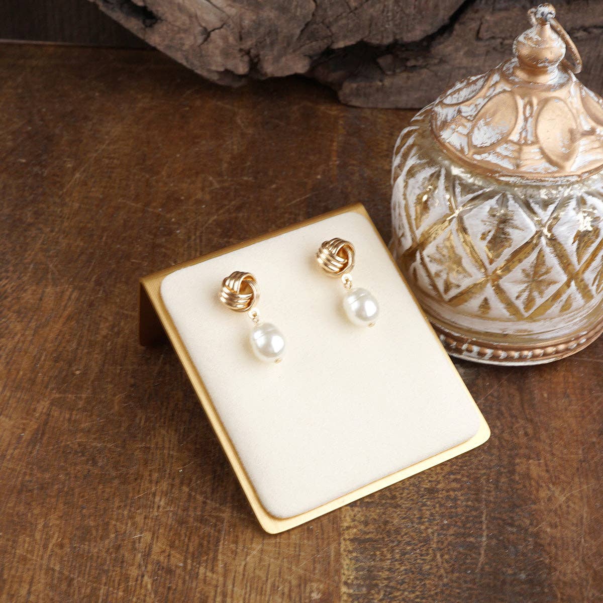 A little romance, a little classic charm. These semi-statement earrings feature a textured love knot design with a luminous faux pearl swaying just below. The warm gold tone and timeless silhouette make them as perfect for vintage-inspired looks as they are for modern minimal outfits.