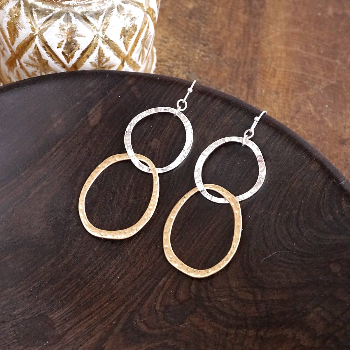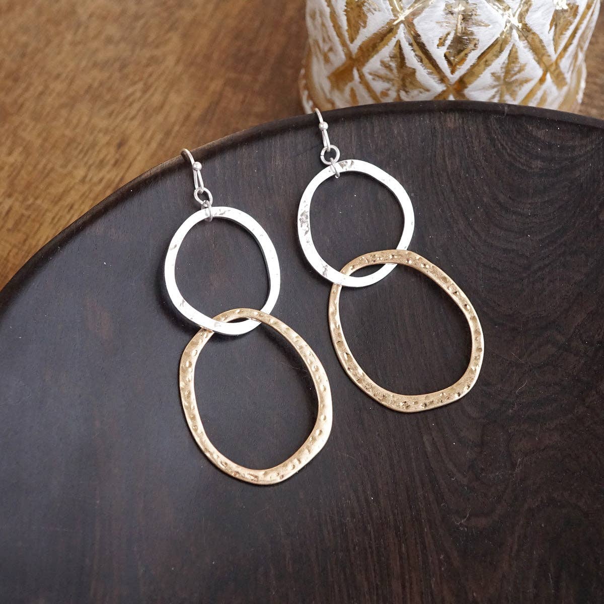 An artful twist on a classic, these asymmetrical hoop earrings bring an effortless boho charm. The mixed metal design—worn silver and gold-tone—creates a versatile, easy-to-style look. Lightweight with a graceful movement, they’re perfect for everyday wear.