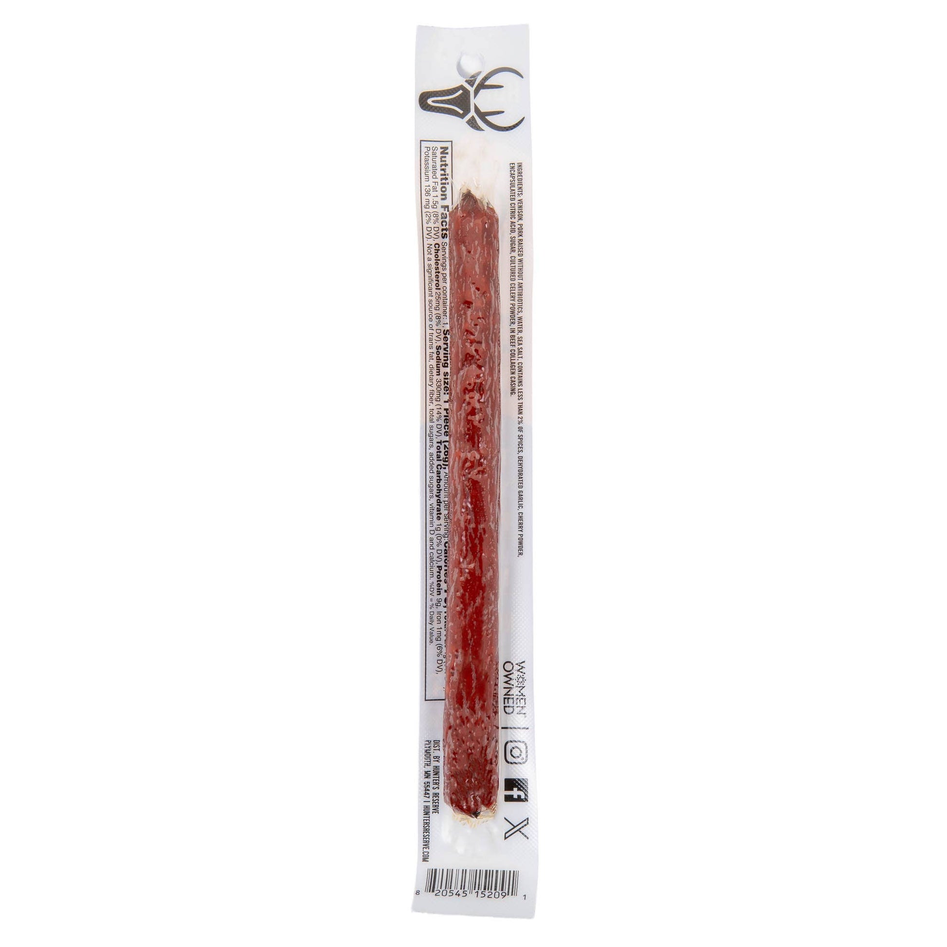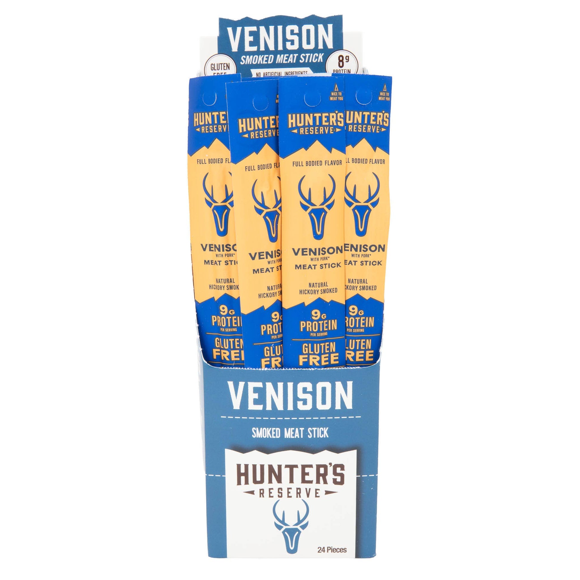 9oz individually wrapped Venison meat sticks. Flavor Profile: Savory - lightly peppered Packaged in a tear off caddie that doubles as a display unit. Each stick is all-natural, nitrite-free, MSG-free and gluten-free.