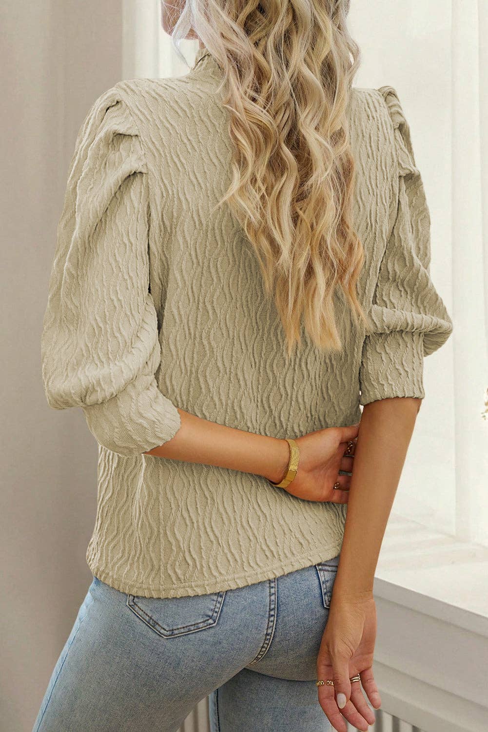 This top boasts a combination of retro and modern fashion, with a unique textured fabric adding a touch of elegance and sophistication. The puff sleeves create a dramatic silhouette that makes a statement, while the mock neck detail adds a chic and polished touch, suitable for both casual and dressy occasions.