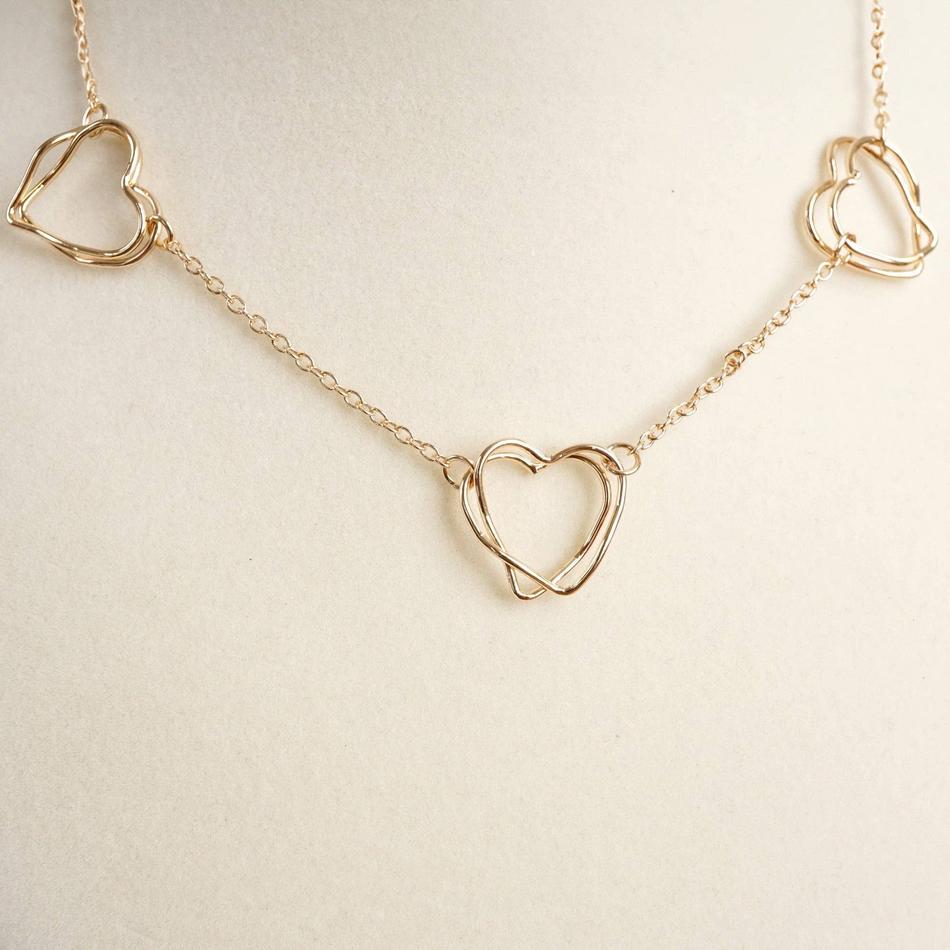 Wire-Inspired Hearts Necklace – Gold Tone A beautiful dainty necklace featuring three wire-style hearts, offering a unique and delicate design. Perfect for Valentine’s Day or as a heartfelt gift. Matching earrings available separately. Details: * 3 wire-style heart pendants, each 0.75" * 14" neckline necklace + 3" extender * Gold-tone finish * Lobster claw clasp *